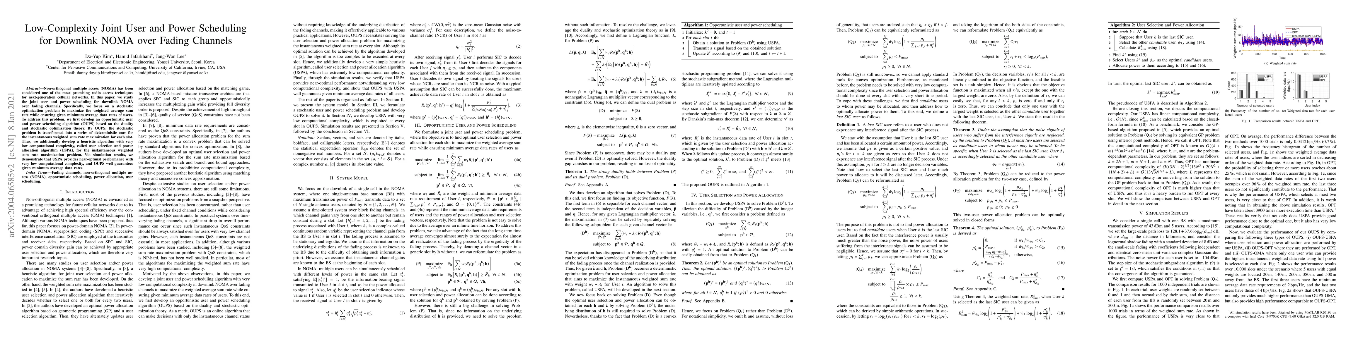 This paper proposes low-complexity algorithms for joint user and power scheduling in downlink NOMA over fading channels to maximize weighted average sum rate. The developed OUPS algorithm transforms the stochastic optimization problem into deterministic subproblems, and the USPA heuristic achieves near-optimal performance with minimal computational complexity.