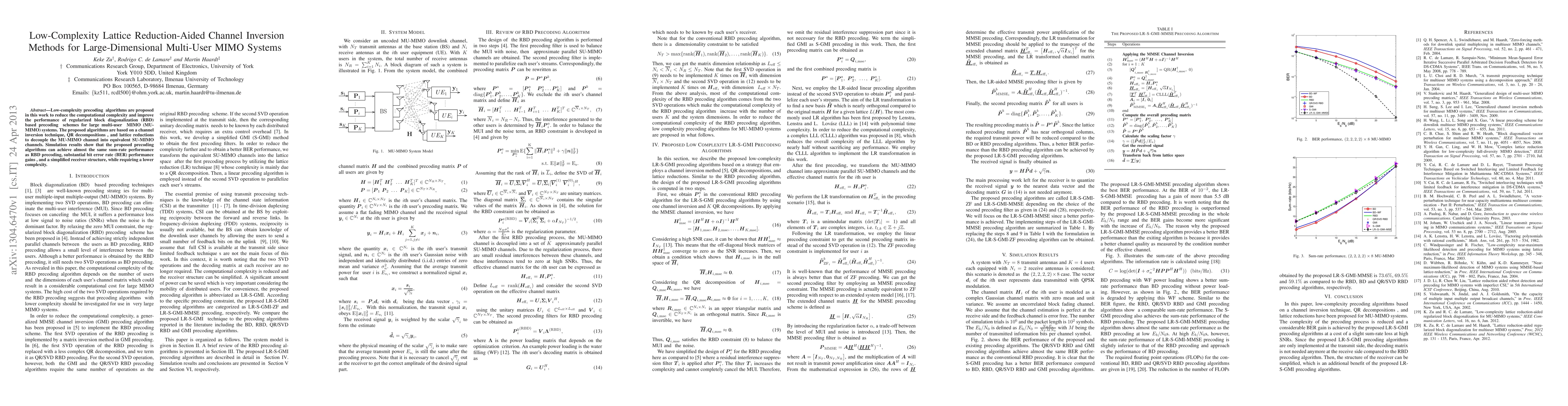 Low-complexity precoding {algorithms} are proposed in this work to reduce the computational complexity and improve the performance of regularized block diagonalization (RBD) {based} precoding {schemes} for large multi-user {MIMO} (MU-MIMO) systems. The proposed algorithms are based on a channel inversion technique, QR decompositions{,} and lattice reductions to decouple the MU-MIMO channel into equivalent SU-MIMO channels. Simulation results show that the proposed precoding algorithms can achieve almost the same sum-rate performance as RBD precoding, substantial bit error rate (BER) performance gains{,} and a simplified receiver structure, while requiring a lower complexity.