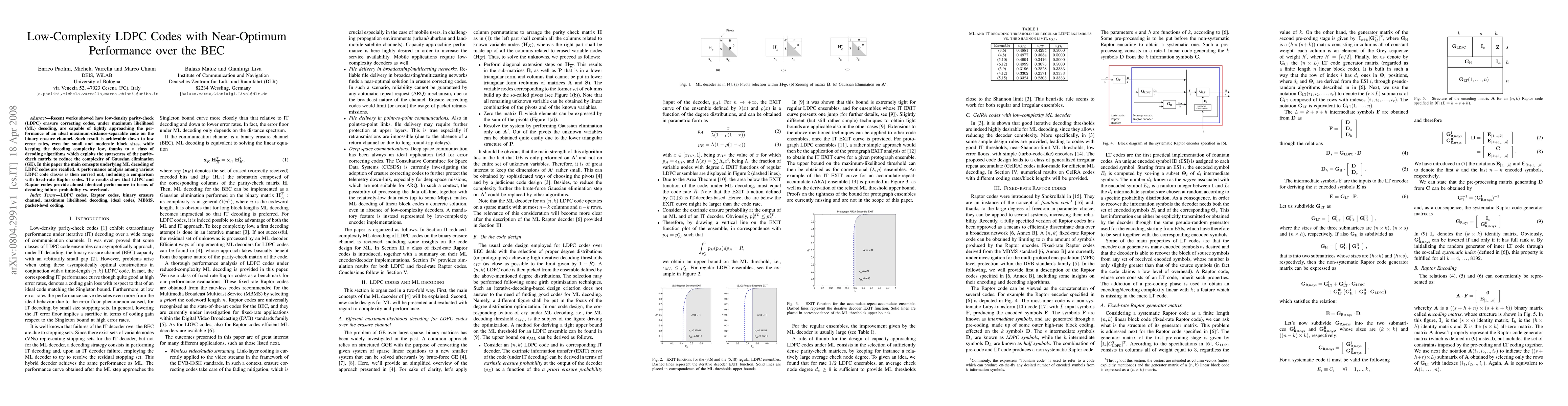 Low-density parity-check (LDPC) codes achieve near-optimum performance on the binary erasure channel with low decoding complexity, comparable to Raptor codes in terms of error rates.
