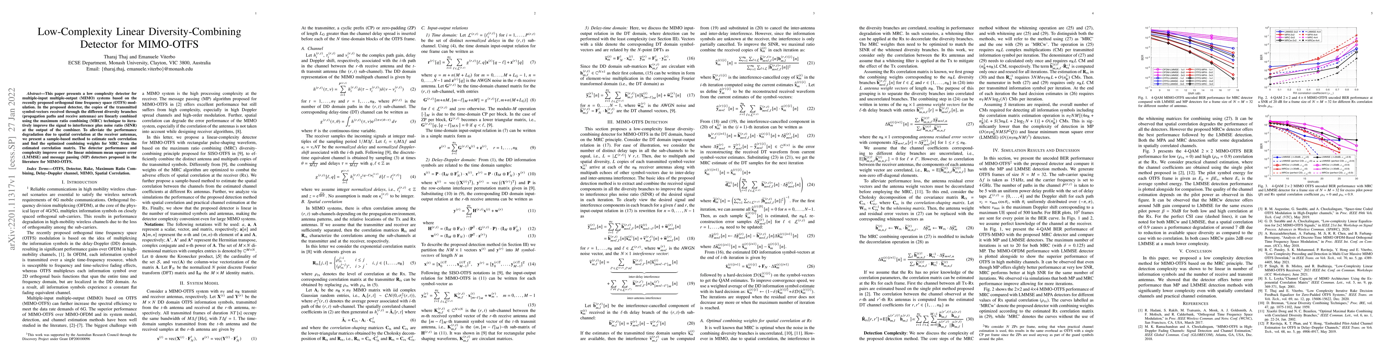 This paper introduces a low-complexity linear diversity-combining detector for MIMO-OTFS systems, utilizing maximum ratio combining to iteratively enhance signal quality. It employs a sample-based method to estimate spatial correlation and optimize combining weights, outperforming existing LMMSE and message passing detectors in both performance and complexity.