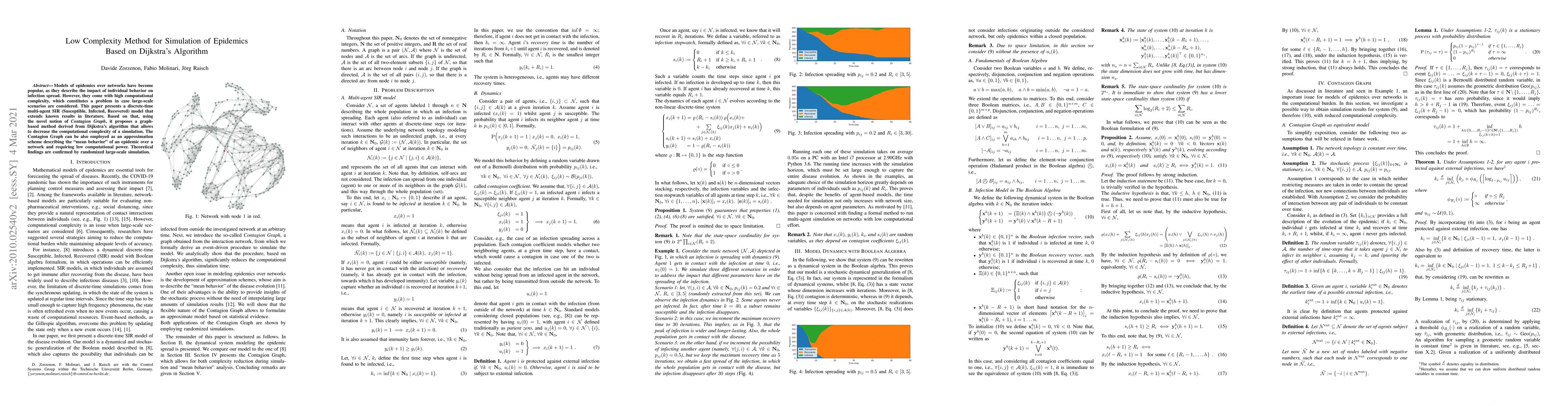 This paper introduces a low complexity method for epidemic simulation using Dijkstra's algorithm, proposing a Contagion Graph to reduce computational complexity in large-scale scenarios. The method is validated through large-scale simulations confirming its theoretical findings.