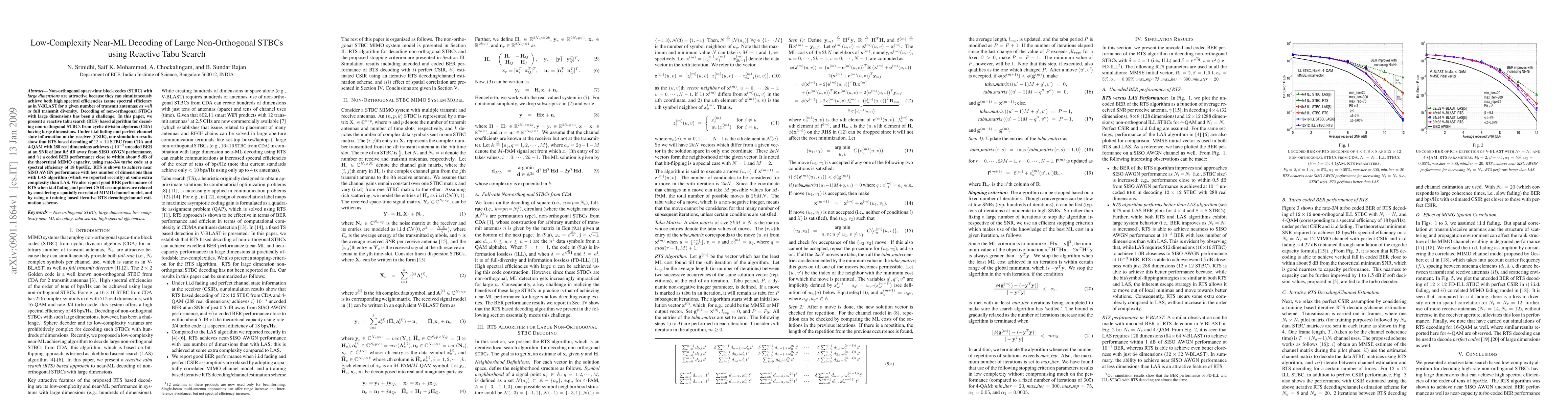 This paper proposes a reactive tabu search (RTS) algorithm for decoding large non-orthogonal space-time block codes (STBCs) from cyclic division algebras, achieving near-optimal performance with lower complexity compared to previous methods. Simulation results show RTS achieves near SISO AWGN performance and near theoretical MIMO capacity with reduced dimensions.