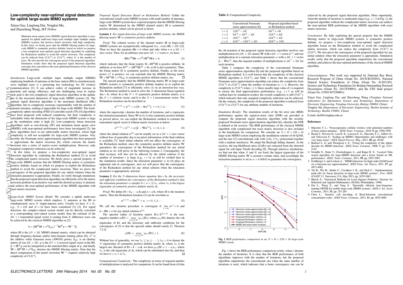 This paper presents a low-complexity, near-optimal signal detection algorithm for uplink multi-user large-scale MIMO systems, reducing complexity from O(K³) to O(K²) by avoiding matrix inversion using the Richardson method. Simulation results demonstrate fast convergence and near-optimal performance.