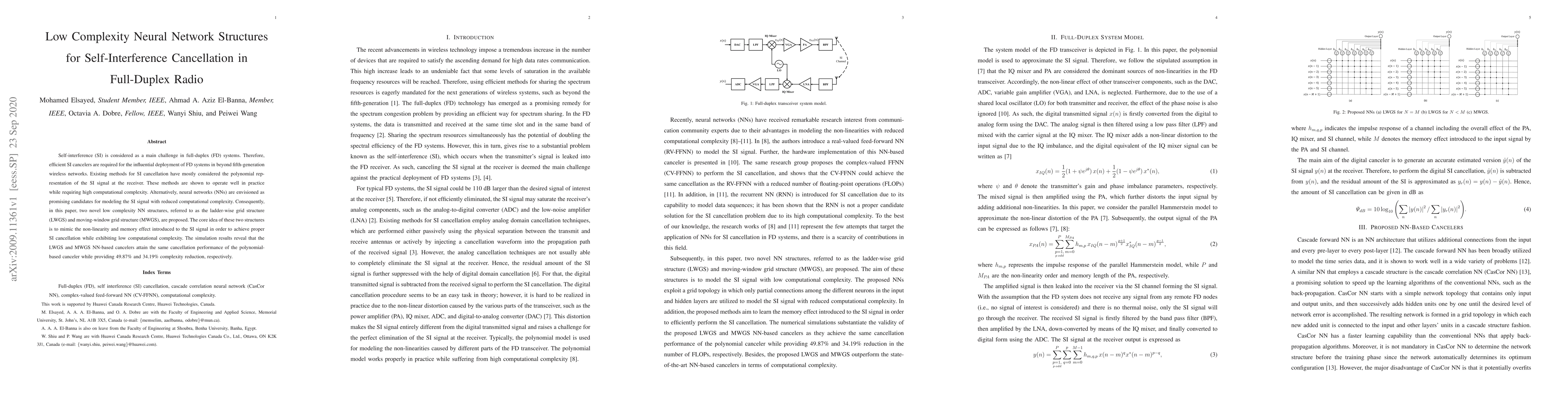 Two new neural network structures reduce computational complexity for self-interference cancellation in full-duplex radio systems, achieving 49.87% and 34.19% reductions compared to polynomial-based cancelers.