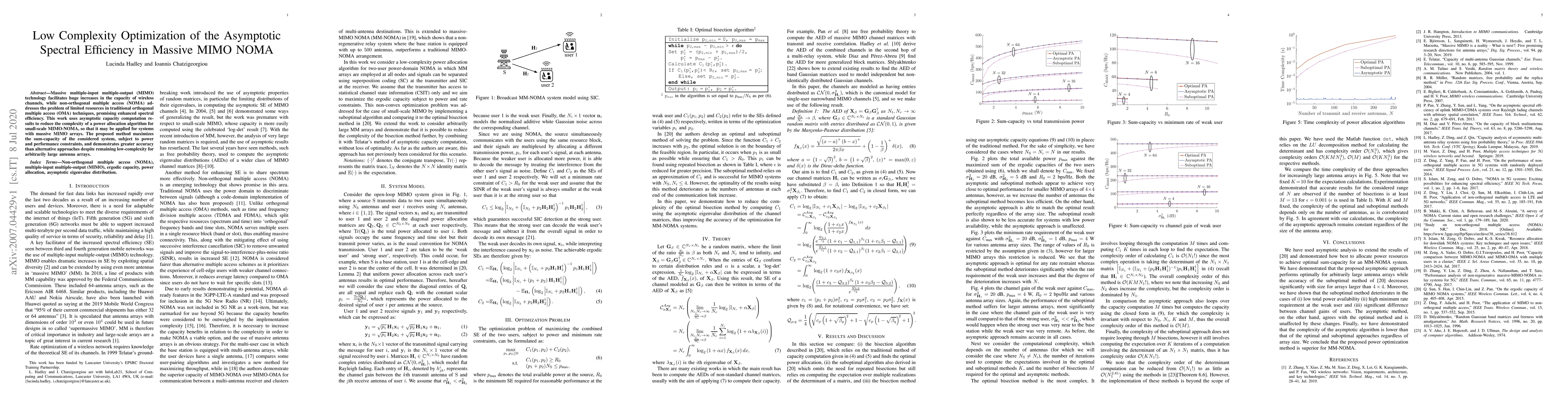 This paper proposes a low complexity optimization algorithm for maximizing the sum-capacity of massive MIMO NOMA systems, leveraging asymptotic capacity results to enhance spectral efficiency while maintaining simplicity for large antenna arrays. The method demonstrates superior accuracy compared to other approaches.