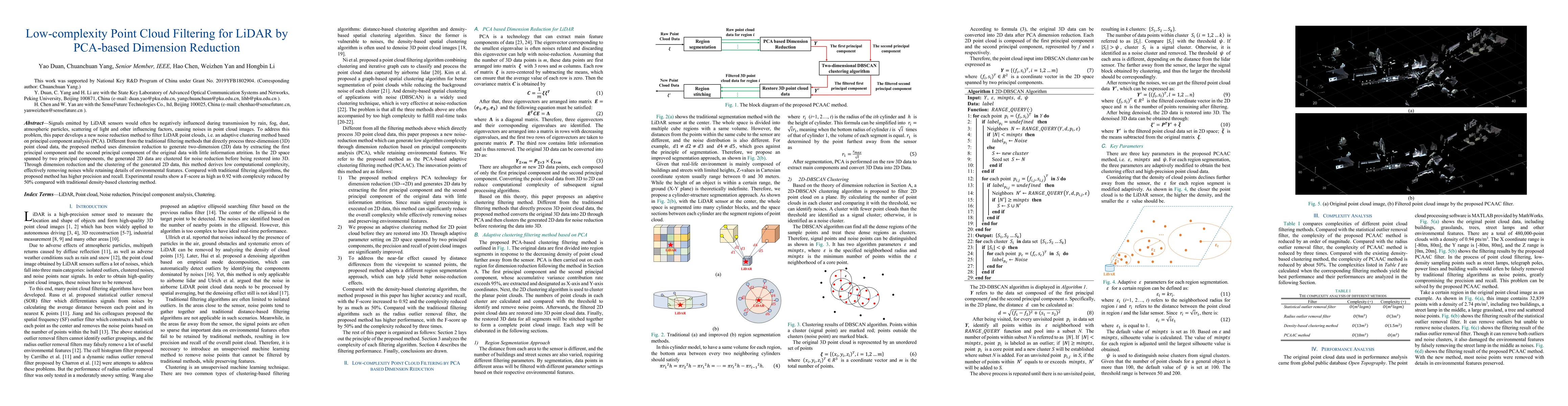 Signals emitted by LiDAR sensors would often be negatively influenced during transmission by rain, fog, dust, atmospheric particles, scattering of light and other influencing factors, causing noises in point cloud images. To address this problem, this paper develops a new noise reduction method to filter LiDAR point clouds, i.e. an adaptive clustering method based on principal component analysis (PCA). Different from the traditional filtering methods that directly process three-dimension (3D) point cloud data, the proposed method uses dimension reduction to generate two-dimension (2D) data by extracting the first principal component and the second principal component of the original data with little information attrition. In the 2D space spanned by two principal components, the generated 2D data are clustered for noise reduction before being restored into 3D. Through dimension reduction and the clustering of the generated 2D data, this method derives low computational complexity, effectively removing noises while retaining details of environmental features. Compared with traditional filtering algorithms, the proposed method has higher precision and recall. Experimental results show a F-score as high as 0.92 with complexity reduced by 50% compared with traditional density-based clustering method.