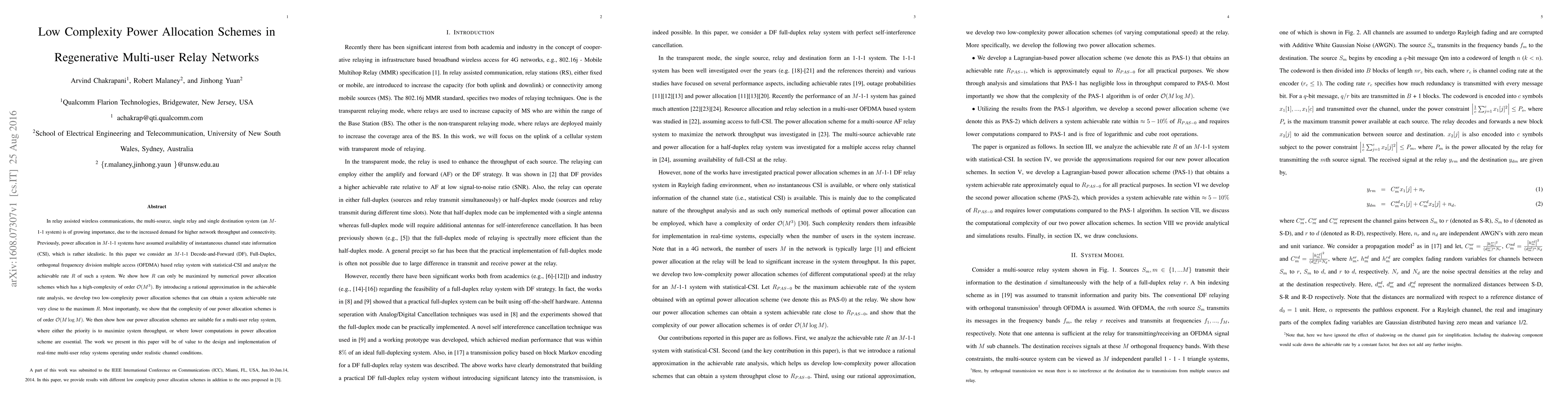 This paper proposes low-complexity power allocation schemes for a regenerative multi-user relay network, specifically addressing an $M$-1-1 DF, Full-Duplex OFDMA system with statistical-CSI. The authors develop two schemes with complexity $\mathcal O(M\log M)$, significantly reducing the computational burden compared to existing high-complexity methods.