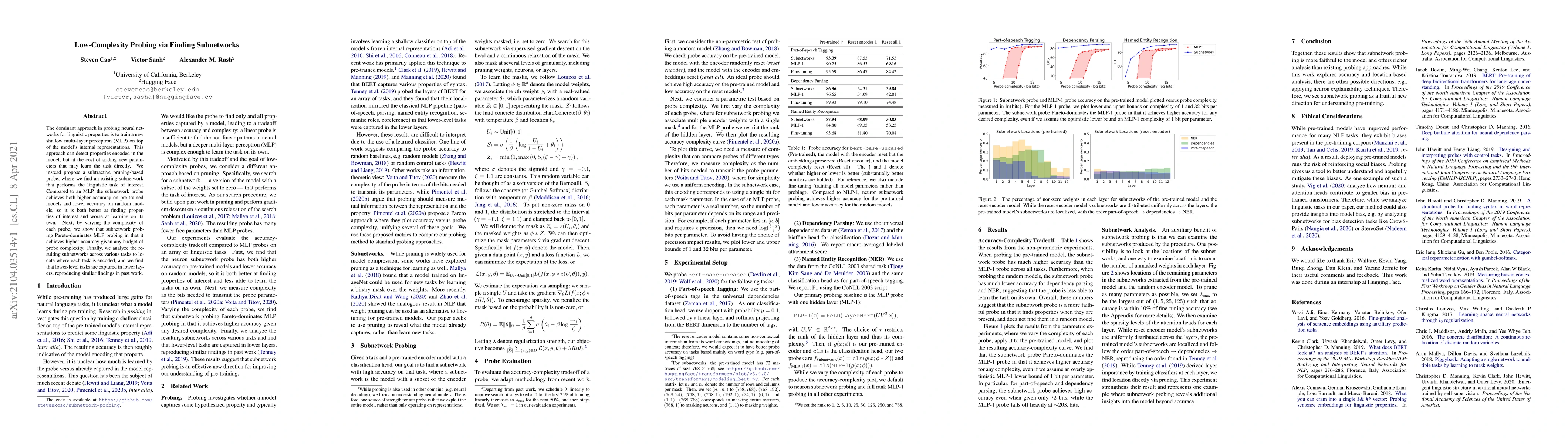 This paper proposes a low-complexity probing method using subnetworks instead of training new MLPs on neural network representations, achieving higher accuracy on pre-trained models and lower on random models. Subnetwork probing outperforms MLP probing in accuracy across complexity budgets.