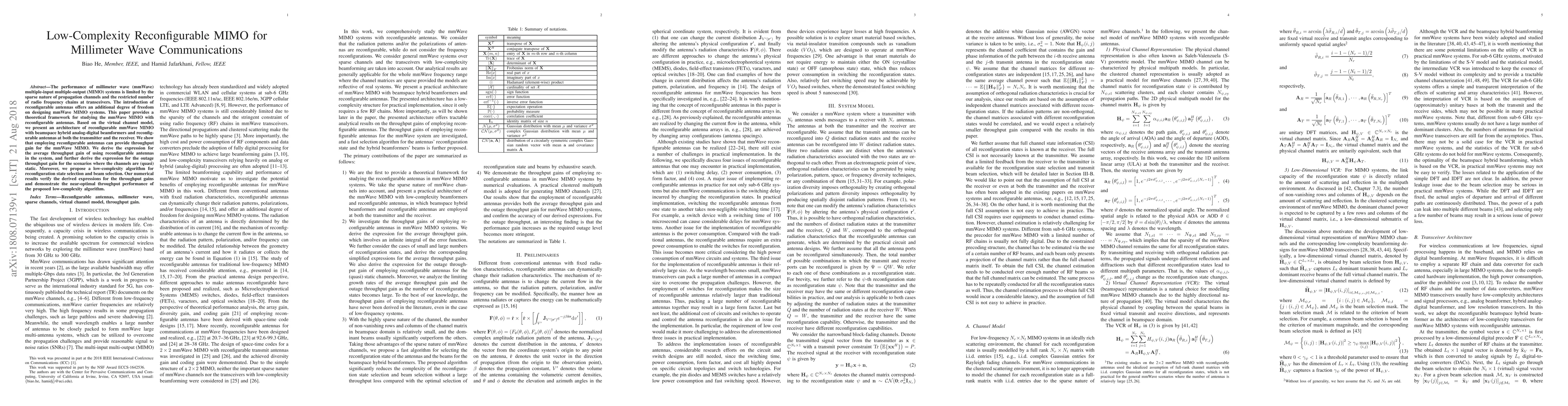 This paper introduces a theoretical framework for low-complexity reconfigurable MIMO systems in millimeter wave communications, proposing an architecture with beamspace hybrid beamformers and reconfigurable antennas. The study demonstrates throughput gains from reconfigurable antennas and presents a low-complexity algorithm for optimal state and beam selection, validated by numerical results.