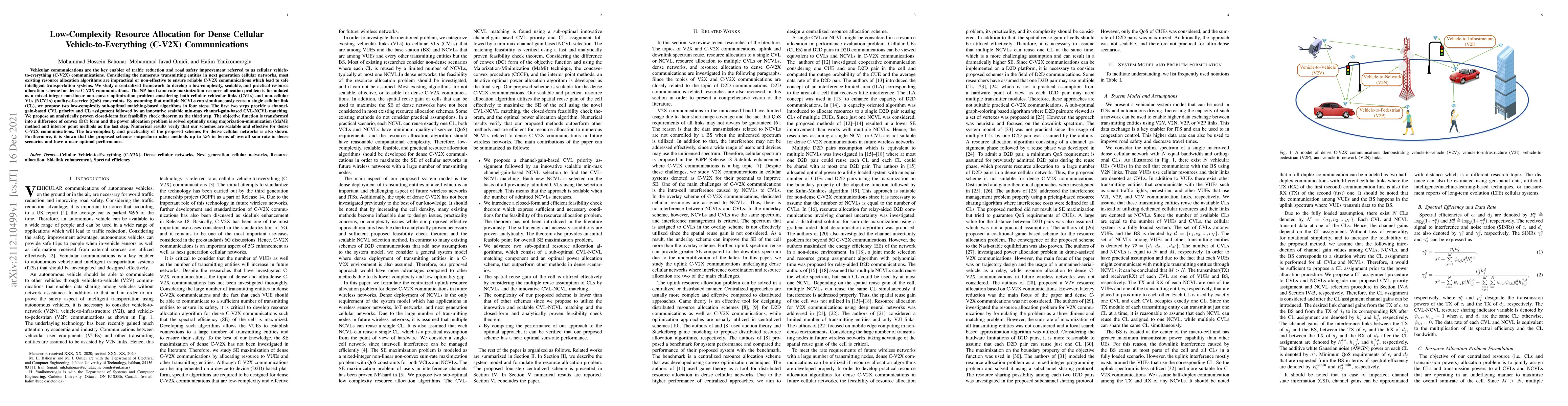 Vehicular communications are the key enabler of traffic reduction and road safety improvement referred to as cellular vehicle-to-everything (C-V2X) communications. Considering the numerous transmitting entities in next generation cellular networks, most existing resource allocation algorithms are impractical or non-effective to ensure reliable C-V2X communications which lead to safe intelligent transportation systems. We study a centralized framework to develop a low-complexity, scalable, and practical resource allocation scheme for dense C-V2X communications. The NP-hard sum-rate maximization resource allocation problem is formulated as a mixed-integer non-linear non-convex optimization problem considering both cellular vehicular links (CVLs) and non-cellular VLs (NCVLs) quality-of-service (QoS) constraints. By assuming that multiple NCVLs can simultaneously reuse a single cellular link (CL), we propose two low-complexity sub-optimal matching-based algorithms in four steps. The first two steps provide a channel gain-based CVL priority and CL assignment followed by an innovative scalable min-max channel-gain-based CVL-NCVL matching. We propose an analytically proven closed-form fast feasibility check theorem as the third step. The objective function is transformed into a difference of convex (DC) form and the power allocation problem is solved optimally using majorization-minimization (MaMi) method and interior point methods as the last step. Numerical results verify that our schemes are scalable and effective for dense C-V2X communications. The low-complexity and practicality of the proposed schemes for dense cellular networks is also shown. Furthermore, it is shown that the proposed schemes outperform other methods up to %6 in terms of overall sum-rate in dense scenarios and have a near optimal performance.