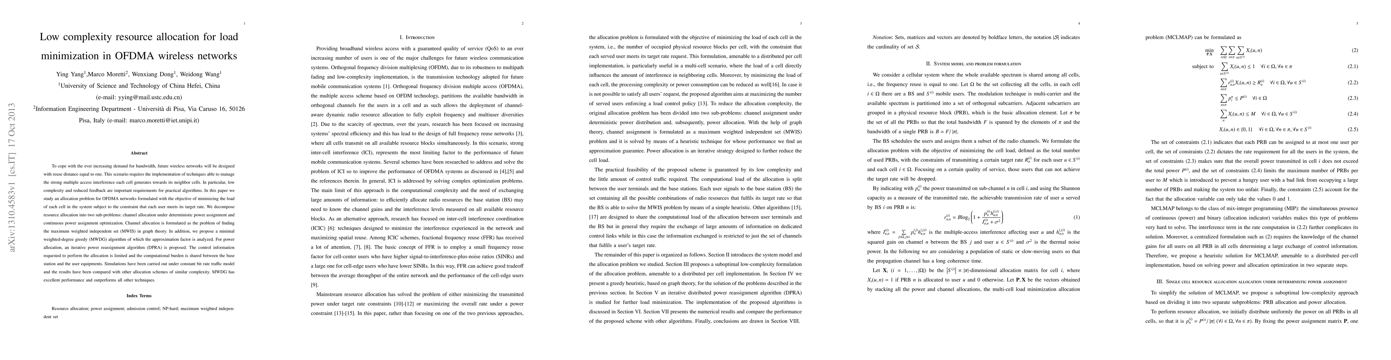 This paper proposes low complexity resource allocation techniques for OFDMA wireless networks to minimize cell load while managing interference. It decomposes the problem into channel allocation and power assignment, using a minimal weighted-degree greedy algorithm and an iterative power reassignment method, achieving superior performance compared to other methods.