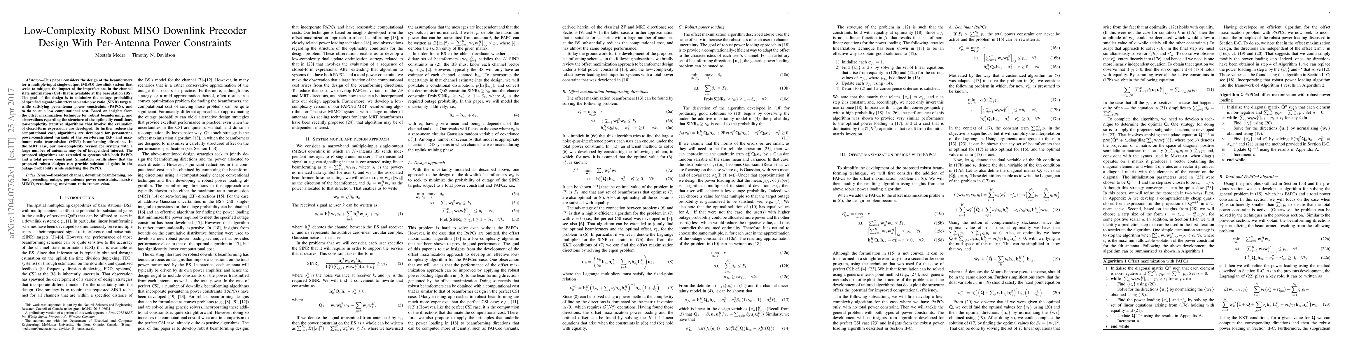 This paper proposes low-complexity robust precoder designs for MISO downlink systems to minimize outage probability under per-antenna power constraints, leveraging offset maximization and zero-forcing techniques. Simulation results demonstrate significant improvements in outage probability while adhering to power limits.