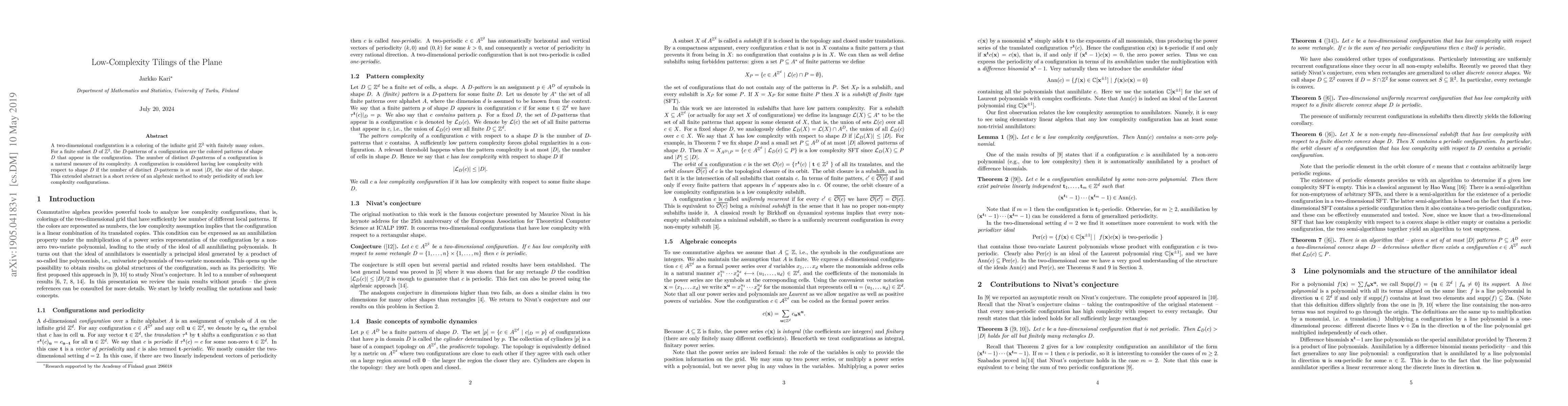 A two-dimensional configuration is a coloring of the infinite grid Z^2 with finitely many colors. For a finite subset D of Z^2, the D-patterns of a configuration are the colored patterns of shape D that appear in the configuration. The number of distinct D-patterns of a configuration is a natural measure of its complexity. A configuration is considered having low complexity with respect to shape D if the number of distinct D-patterns is at most |D|, the size of the shape. This extended abstract is a short review of an algebraic method to study periodicity of such low complexity configurations.