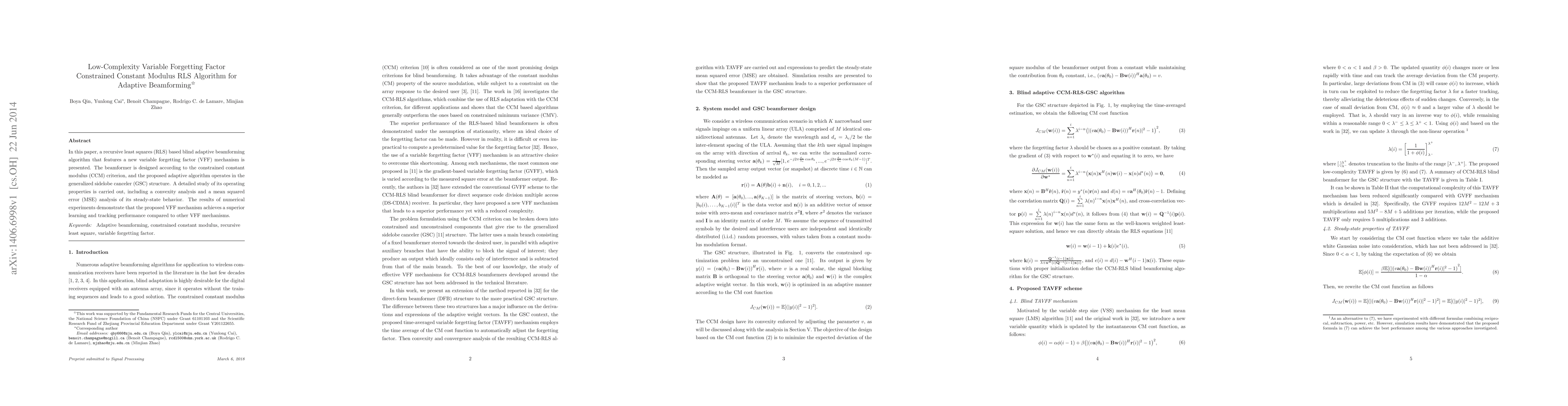 This paper introduces a low-complexity adaptive beamforming algorithm using a recursive least squares (RLS) approach with a novel variable forgetting factor (VFF) mechanism. The algorithm operates within the constrained constant modulus (CCM) criterion and generalized sidelobe canceler (GSC) structure, showing superior learning and tracking performance in numerical experiments.