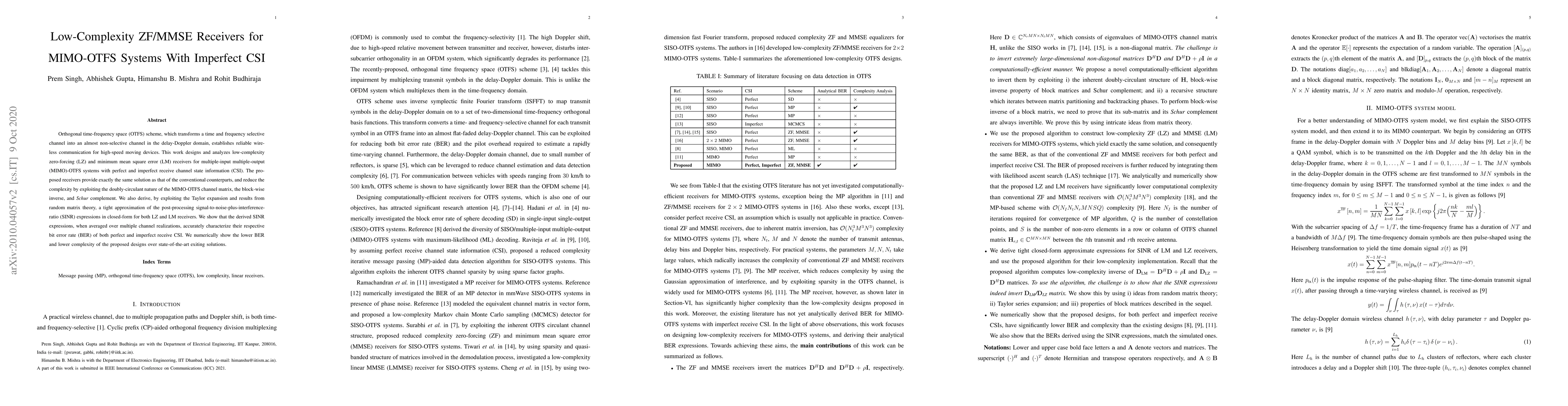 This paper proposes low-complexity zero-forcing and minimum mean square error receivers for MIMO-OTFS systems, leveraging the doubly-circulant nature of the channel matrix to reduce complexity. The study also derives closed-form SINR expressions that accurately characterize the bit error rate under both perfect and imperfect CSI conditions.