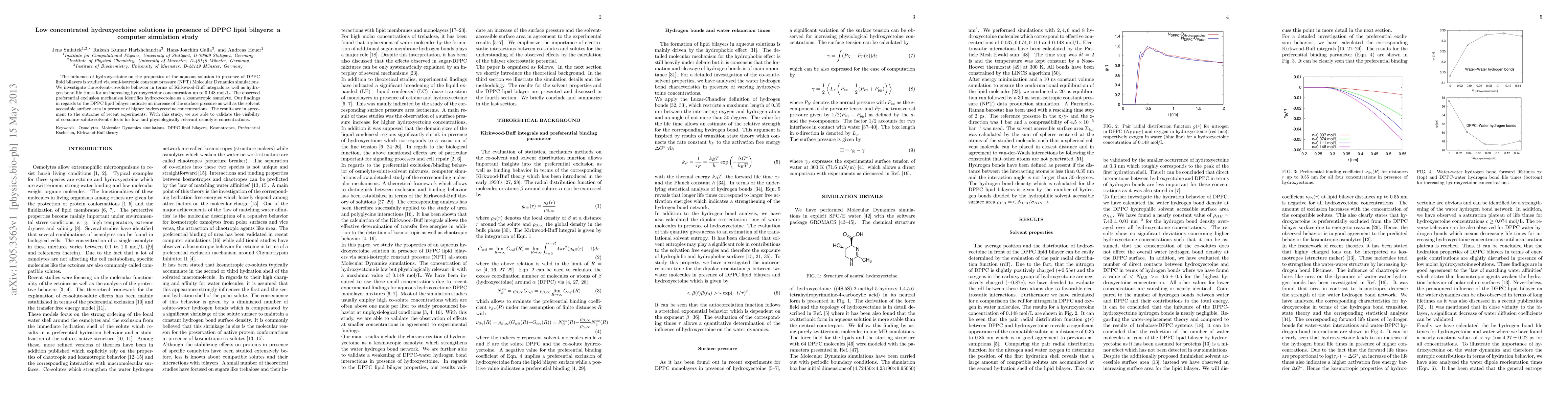 This study uses Molecular Dynamics simulations to explore how hydroxyectoine affects aqueous solutions and DPPC lipid bilayers, revealing a kosmotropic behavior and increased surface pressure with higher hydroxyectoine concentrations, validating co-solute-solute-solvent interactions at low concentrations.
