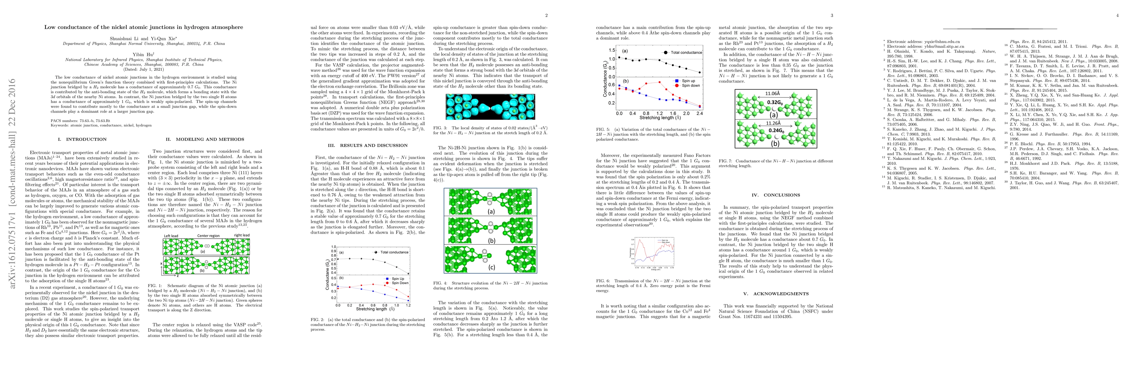 The low conductance of nickel atomic junctions in the hydrogen environment is studied using the nonequilibrium Green's function theory combined with first-principles calculations. The Ni junction bridged by a $H_2$ molecule has a conductance of approximately 0.7 $G_0$. This conductance is contributed by the anti-bonding state of the $H_2$ molecule, which forms a bonding state with the $3d$ orbitals of the nearby Ni atoms. In contrast, the Ni junction bridged by the two single H atoms has a conductance of approximately 1 $G_0$, which is weakly spin-polarized. The spin-up channels were found to contribute mostly to the conductance at a small junction gap, while the spin-down channels play a dominant role at a larger junction gap.