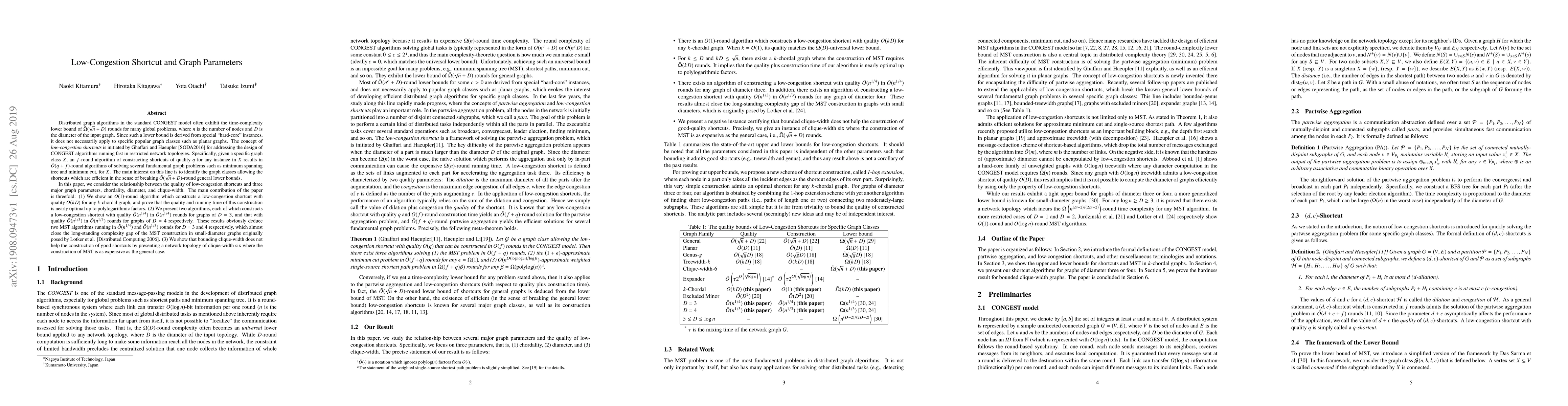 This paper explores the relationship between low-congestion shortcuts and key graph parameters, including chordality, diameter, and clique-width. It presents efficient algorithms for constructing such shortcuts in specific graph classes, significantly improving the complexity of minimum spanning tree (MST) algorithms in small-diameter graphs.