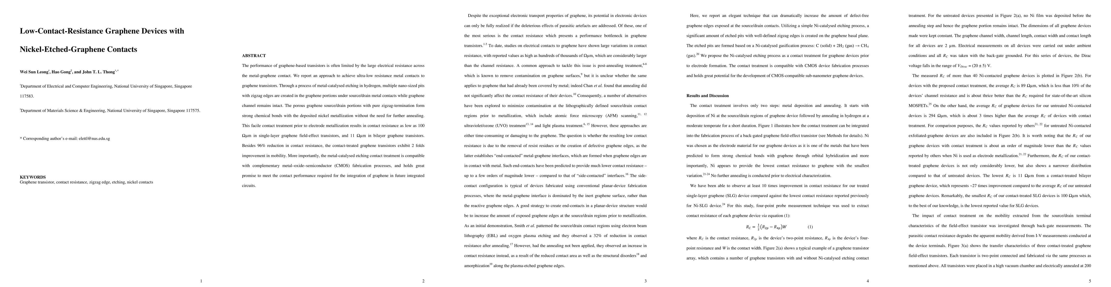 This paper reports a method for achieving ultra-low contact resistance in graphene transistors by creating nickel-etched graphene contacts via metal-catalyzed etching in hydrogen, resulting in contact resistance as low as 100 ohm-um in single-layer graphene and 11 ohm-um in bilayer graphene, compatible with CMOS fabrication.