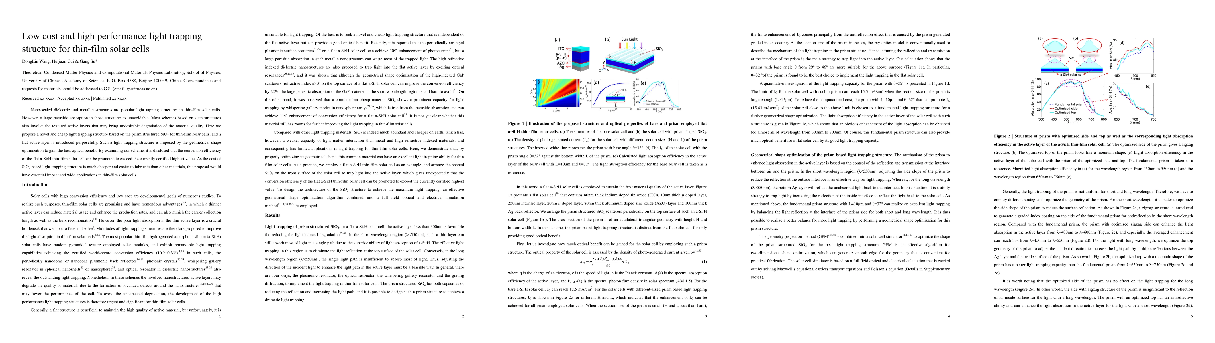 This paper proposes a low-cost, high-performance light trapping structure using prism-shaped SiO2 for thin-film solar cells, which avoids parasitic absorption and material degradation. The optimized design aims to surpass current efficiency records, offering significant cost benefits and potential widespread application.