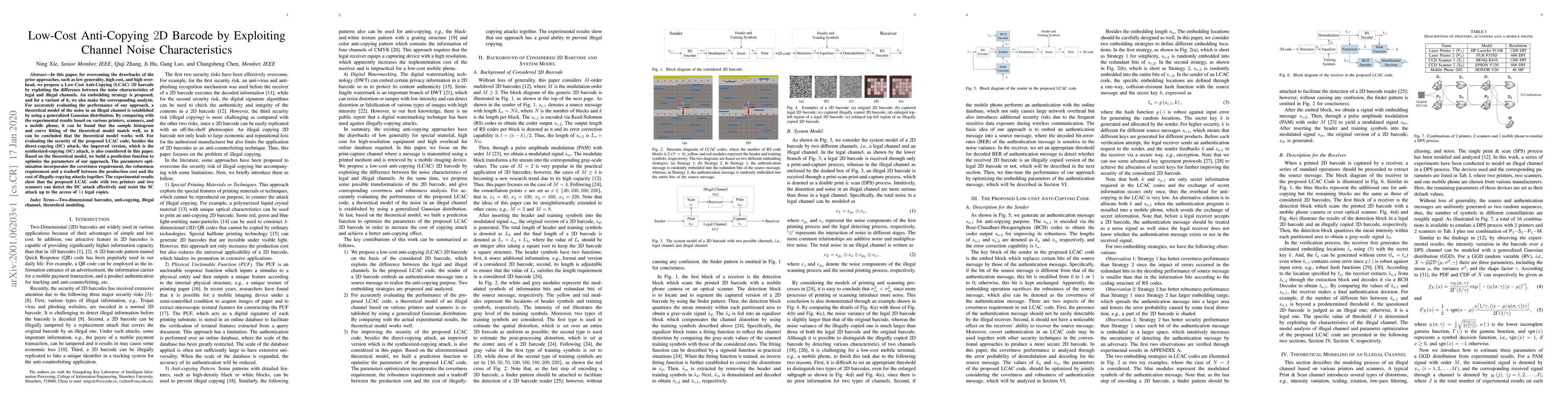 In this paper, for overcoming the drawbacks of the prior approaches, such as low generality, high cost, and high overhead, we propose a Low-Cost Anti-Copying (LCAC) 2D barcode by exploiting the difference between the noise characteristics of legal and illegal channels. An embedding strategy is proposed, and for a variant of it, we also make the corresponding analysis. For accurately evaluating the performance of our approach, a theoretical model of the noise in an illegal channel is established by using a generalized Gaussian distribution. By comparing with the experimental results based on various printers, scanners, and a mobile phone, it can be found that the sample histogram and curve fitting of the theoretical model match well, so it can be concluded that the theoretical model works well. For evaluating the security of the proposed LCAC code, besides the direct-copying (DC) attack, the improved version, which is the synthesized-copying (SC) attack, is also considered in this paper. Based on the theoretical model, we build a prediction function to optimize the parameters of our approach. The parameters optimization incorporates the covertness requirement, the robustness requirement and a tradeoff between the production cost and the cost of illegally-copying attacks together. The experimental results show that the proposed LCAC code with two printers and two scanners can detect the DC attack effectively and resist the SC attack up to the access of 14 legal copies.