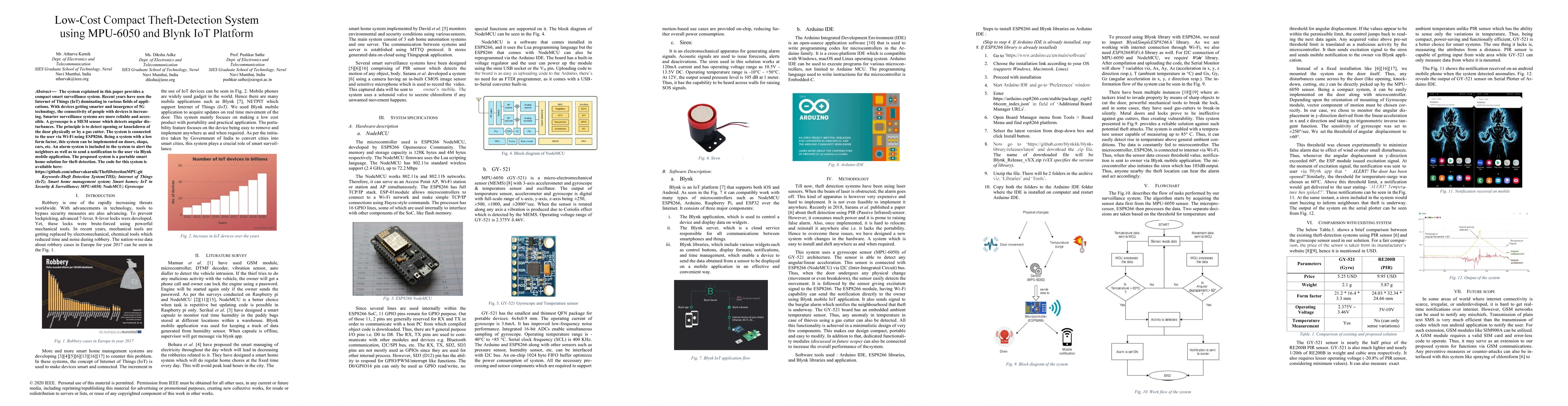 The system explained in this paper provides a compact smart surveillance system. Recent years have seen the Internet of Things (IoT) dominating in various fields of applications. With devices getting smarter and insurgence of 5G technology, the connectivity of people with devices is increasing. Smarter surveillance systems are more reliable and accessible. A gyroscope is a MEM sensor which detects angular disturbances. The principle is to detect opening or knockdown of the door physically or by a gas cutter. The system is connected to the user via Wi-Fi using ESP8266. Being a system with a low form factor, this system can be implemented on doors, shops, cars, etc. An alarm system is included in the system to alert the neighbors as well as to send a notification to the user via Blynk mobile application. The proposed system is a portable smart home solution for theft detection. The code for this system is available here: https://github.com/atharvakarnik/TheftDetectionMPU.git