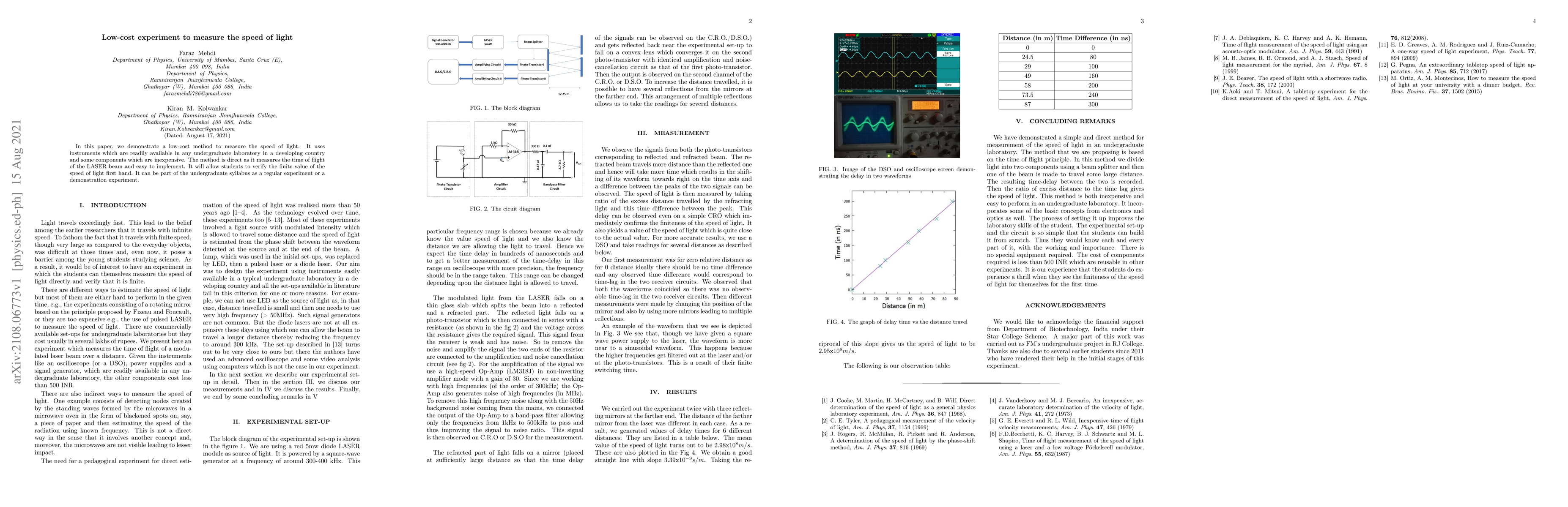 In this paper, we demonstrate a low-cost method to measure the speed of light. It uses instruments which are readily available in any undergraduate laboratory in a developing country and some components which are inexpensive. The method is direct as it measures the time of flight of the LASER beam and easy to implement. It will allow students to verify the finite value of the speed of light first hand. It can be part of the undergraduate syllabus as a regular experiment or a demonstration experiment.
