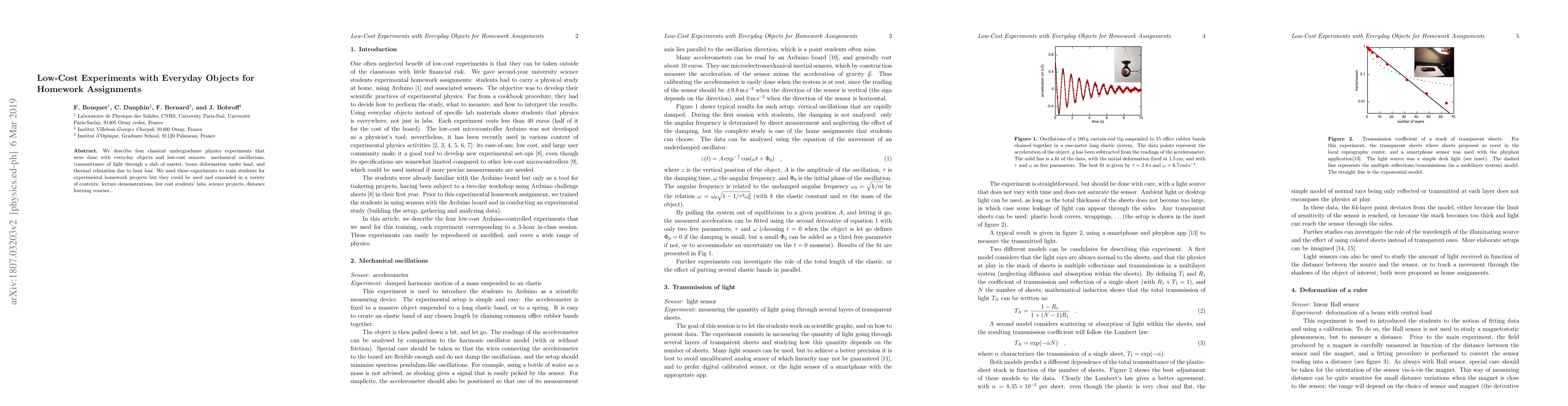 We describe four classical undergraduate physics experiments that were done with everyday objects and low-cost sensors: mechanical oscillations, transmittance of light through a slab of matter, beam deformation under load, and thermal relaxation due to heat loss. We used these experiments to train students for experimental homework projects but they could be used and expanded in a variety of contexts: lecture demonstrations, low cost students' labs, science projects, distance learning courses...