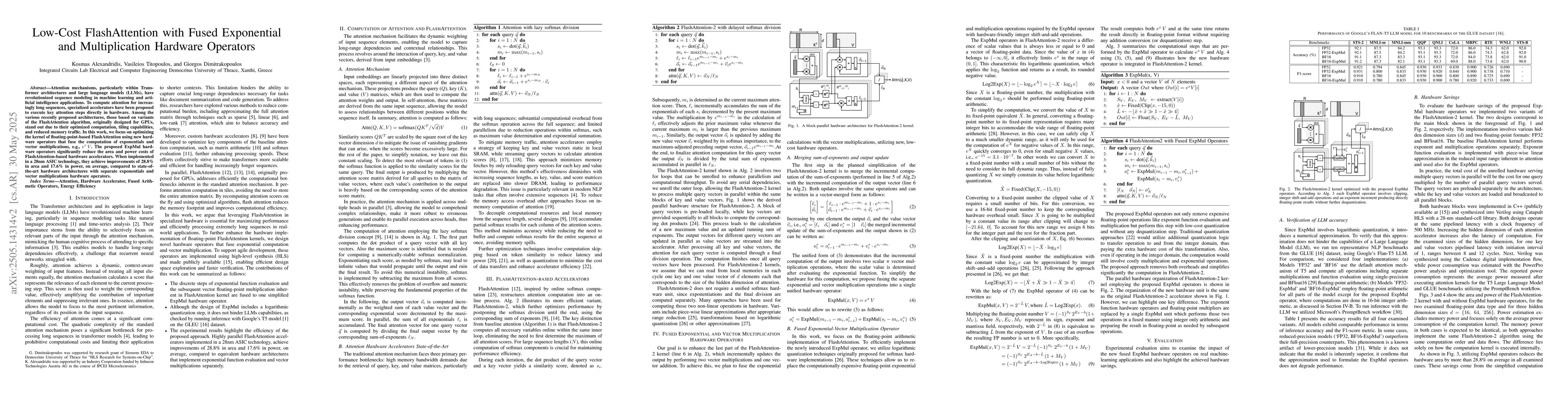 Researchers optimized the FlashAttention algorithm to reduce area and power costs using new hardware operators that fuse exponential and vector multiplications, leading to a 28.8% reduction in area and 17.6% in power compared to previous architectures.