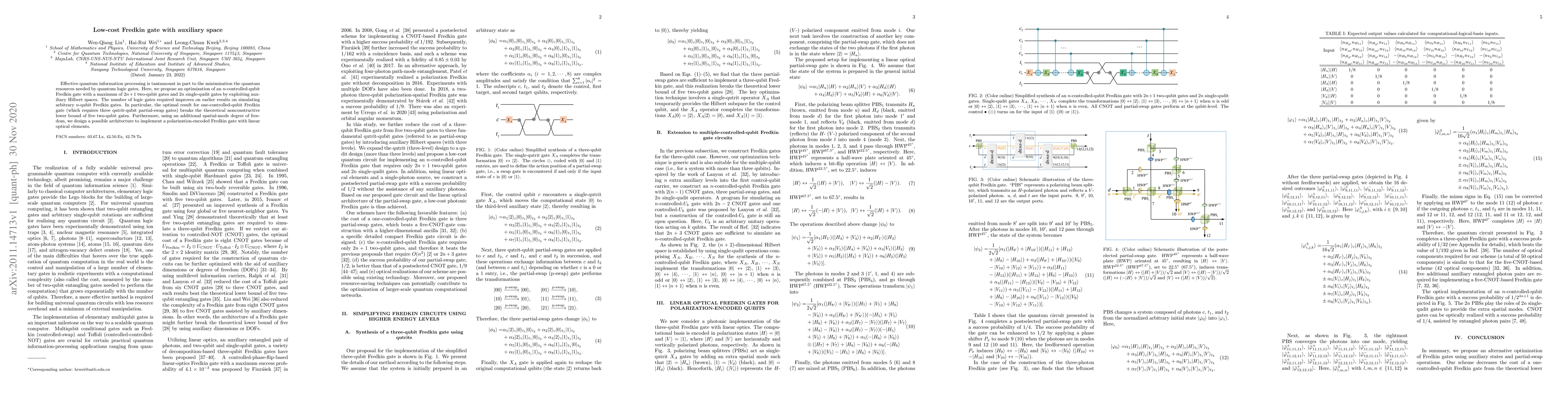 This paper proposes an optimized low-cost Fredkin gate using auxiliary Hilbert spaces, reducing the number of required two-qubit gates to 2n+1 and single-qudit gates to 2n. The design breaks the previous lower bound for a one-controlled-qubit Fredkin gate and suggests a practical implementation using linear optical elements.