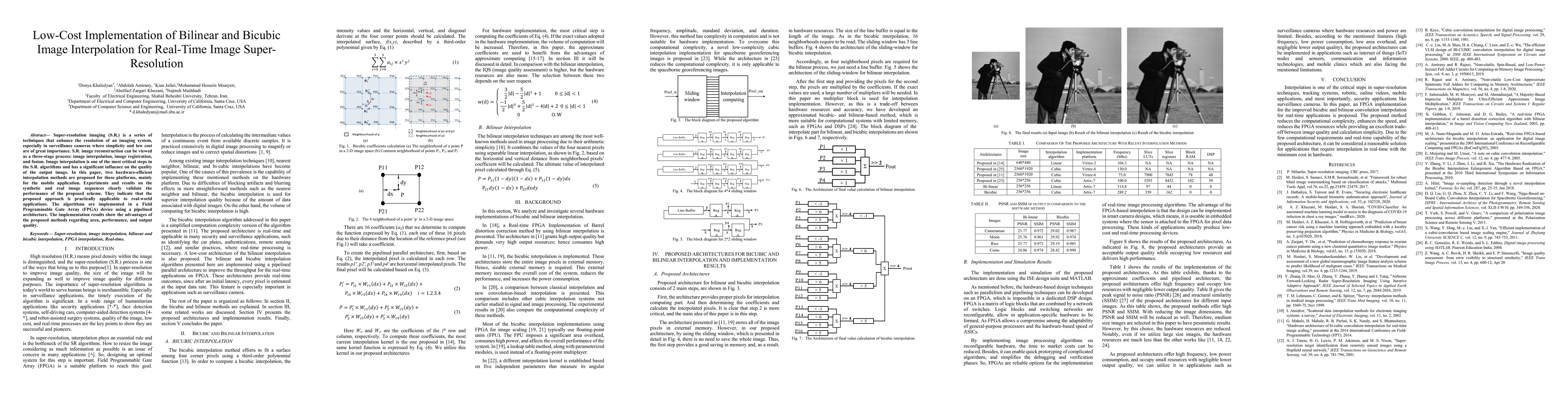 Super-resolution imaging (S.R.) is a series of techniques that enhance the resolution of an imaging system, especially in surveillance cameras where simplicity and low cost are of great importance. S.R. image reconstruction can be viewed as a three-stage process: image interpolation, image registration, and fusion. Image interpolation is one of the most critical steps in the S.R. algorithms and has a significant influence on the quality of the output image. In this paper, two hardware-efficient interpolation methods are proposed for these platforms, mainly for the mobile application. Experiments and results on the synthetic and real image sequences clearly validate the performance of the proposed scheme. They indicate that the proposed approach is practically applicable to real-world applications. The algorithms are implemented in a Field Programmable Gate Array (FPGA) device using a pipelined architecture. The implementation results show the advantages of the proposed methods regarding area, performance, and output quality.