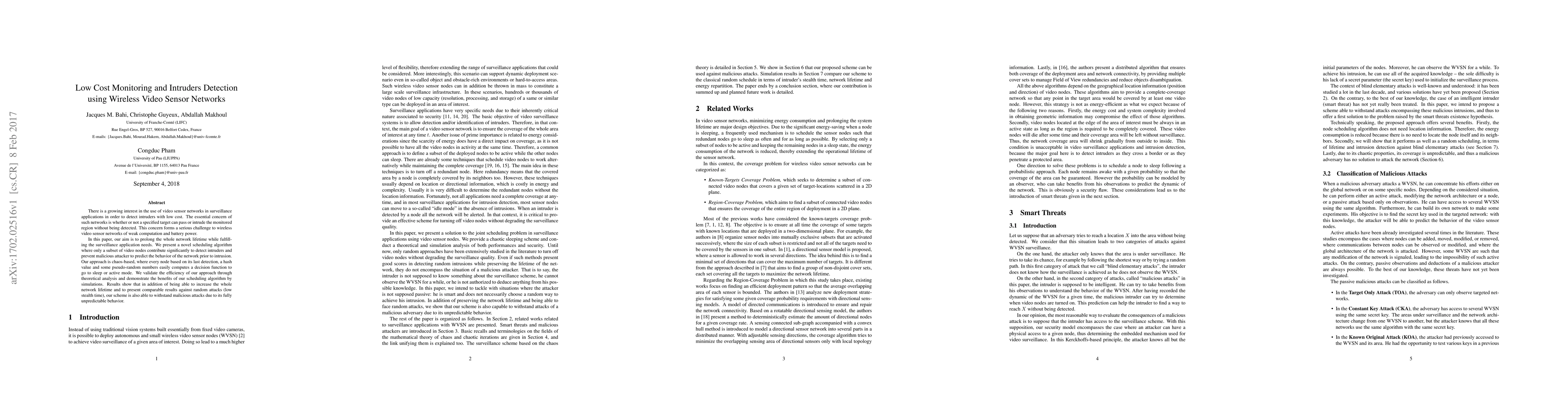 This paper proposes a novel scheduling algorithm for low-cost wireless video sensor networks to detect intruders while prolonging network lifetime and thwarting malicious attacks.