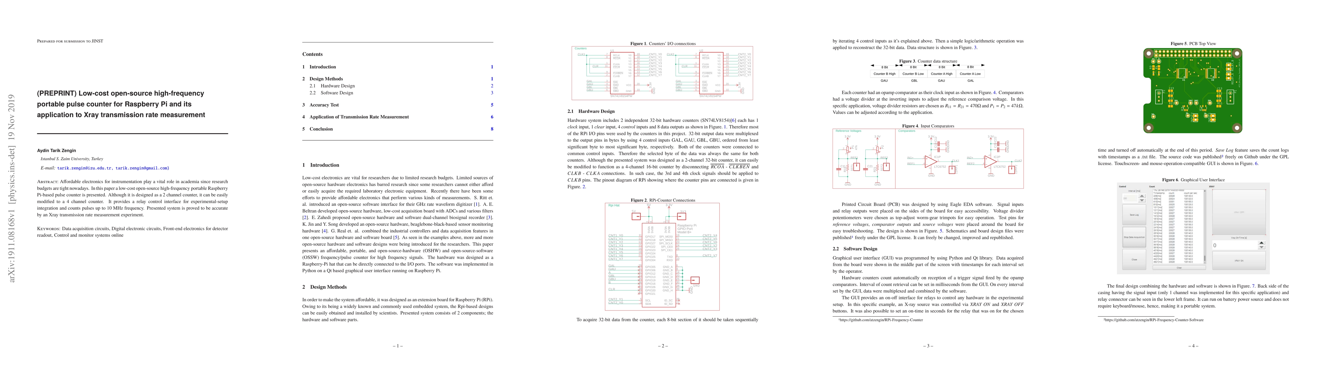 A low-cost open-source high-frequency portable pulse counter was designed for Raspberry Pi using 32-bit independent hardware counters with adjustable threshold levels.