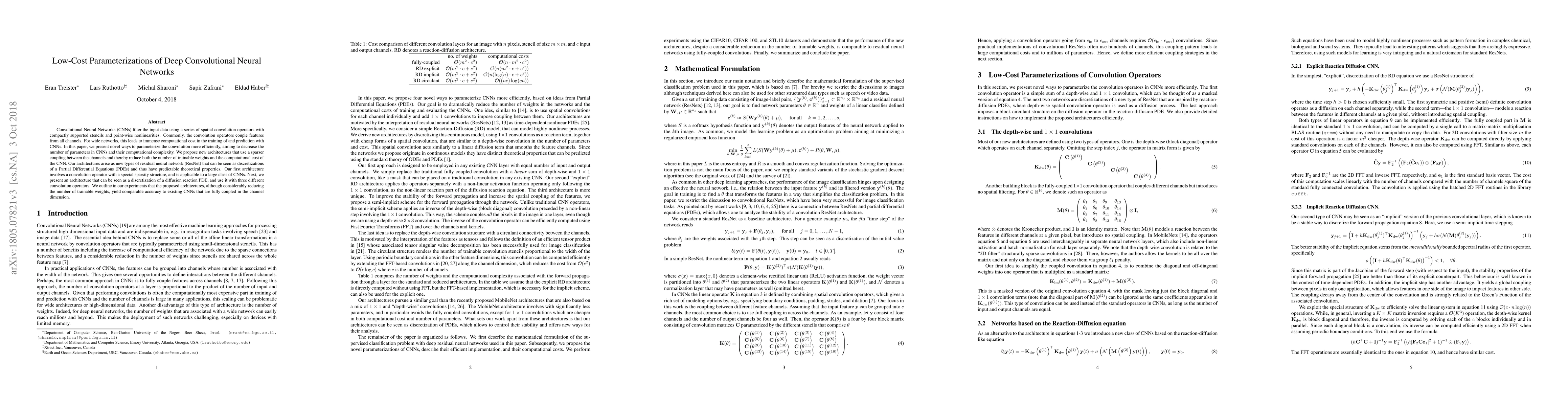 Convolutional Neural Networks (CNNs) filter the input data using a series of spatial convolution operators with compactly supported stencils and point-wise nonlinearities. Commonly, the convolution operators couple features from all channels. For wide networks, this leads to immense computational cost in the training of and prediction with CNNs. In this paper, we present novel ways to parameterize the convolution more efficiently, aiming to decrease the number of parameters in CNNs and their computational complexity. We propose new architectures that use a sparser coupling between the channels and thereby reduce both the number of trainable weights and the computational cost of the CNN. Our architectures arise as new types of residual neural network (ResNet) that can be seen as discretizations of a Partial Differential Equations (PDEs) and thus have predictable theoretical properties. Our first architecture involves a convolution operator with a special sparsity structure, and is applicable to a large class of CNNs. Next, we present an architecture that can be seen as a discretization of a diffusion reaction PDE, and use it with three different convolution operators. We outline in our experiments that the proposed architectures, although considerably reducing the number of trainable weights, yield comparable accuracy to existing CNNs that are fully coupled in the channel dimension.