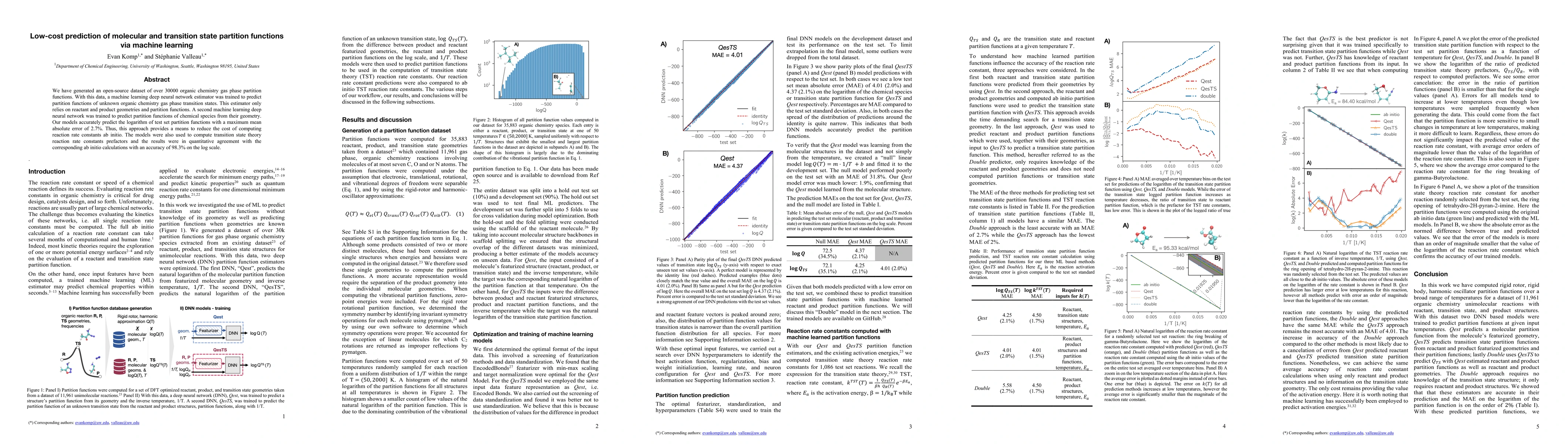 This research develops machine learning models to predict molecular and transition state partition functions using deep neural networks, achieving high accuracy with a maximum mean absolute error of 2.7%. The models reduce computational costs for estimating reaction rate constants, showing 98.3% accuracy in predicting reaction rate constants prefactors compared to ab initio calculations.