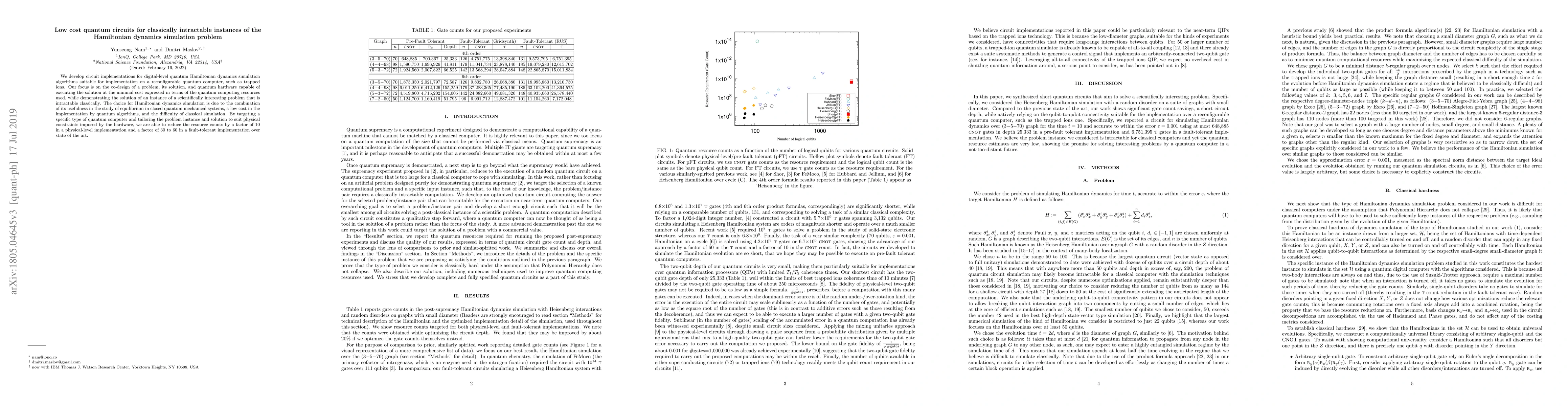 We develop circuit implementations for digital-level quantum Hamiltonian dynamics simulation algorithms suitable for implementation on a reconfigurable quantum computer, such as trapped ions. Our focus is on the co-design of a problem, its solution, and quantum hardware capable of executing the solution at the minimal cost expressed in terms of the quantum computing resources used while demonstrating the solution of an instance of a scientifically interesting problem that is intractable classically. The choice for Hamiltonian dynamics simulation is due to the combination of its usefulness in the study of equilibrium in closed quantum mechanical systems, a low cost in the implementation by quantum algorithms, and the difficulty of classical simulation. By targeting a specific type of quantum computer and tailoring the problem instance and solution to suit physical constraints imposed by the hardware, we are able to reduce the resource counts by a factor of $10$ in a physical-level implementation and a factor of $30$ to $60$ in a fault-tolerant implementation over state of the art.