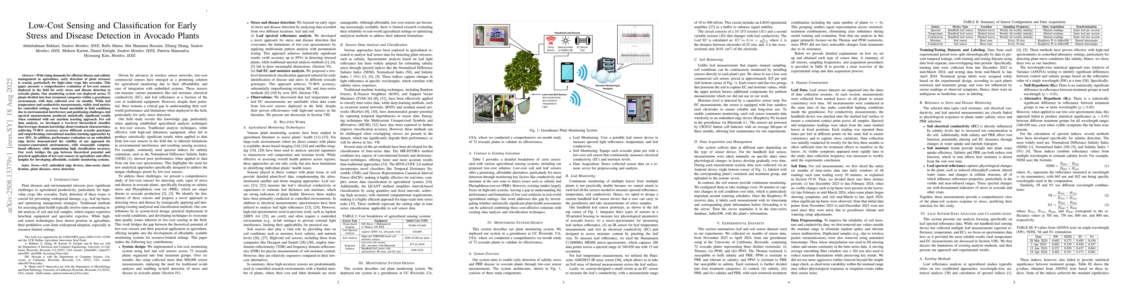 With rising demands for efficient disease and salinity management in agriculture, early detection of plant stressors is crucial, particularly for high-value crops like avocados. This paper presents a comprehensive evaluation of low-cost sensors deployed in the field for early stress and disease detection in avocado plants. Our monitoring system was deployed across 72 plants divided into four treatment categories within a greenhouse environment, with data collected over six months. While leaf temperature and conductivity measurements, widely used metrics for controlled settings, were found unreliable in field conditions due to environmental interference and positioning challenges, leaf spectral measurements produced statistically significant results when combined with our machine learning approach. For soil data analysis, we developed a two-level hierarchical classifier that leverages domain knowledge about treatment characteristics, achieving 75-86\% accuracy across different avocado genotypes and outperforming conventional machine learning approaches by over 20\%. In addition, performance evaluation on an embedded edge device demonstrated the viability of our approach for resource-constrained environments, with reasonable computational efficiency while maintaining high classification accuracy. Our work bridges the gap between theoretical potential and practical application of low-cost sensors in agriculture and offers insights for developing affordable, scalable monitoring systems.