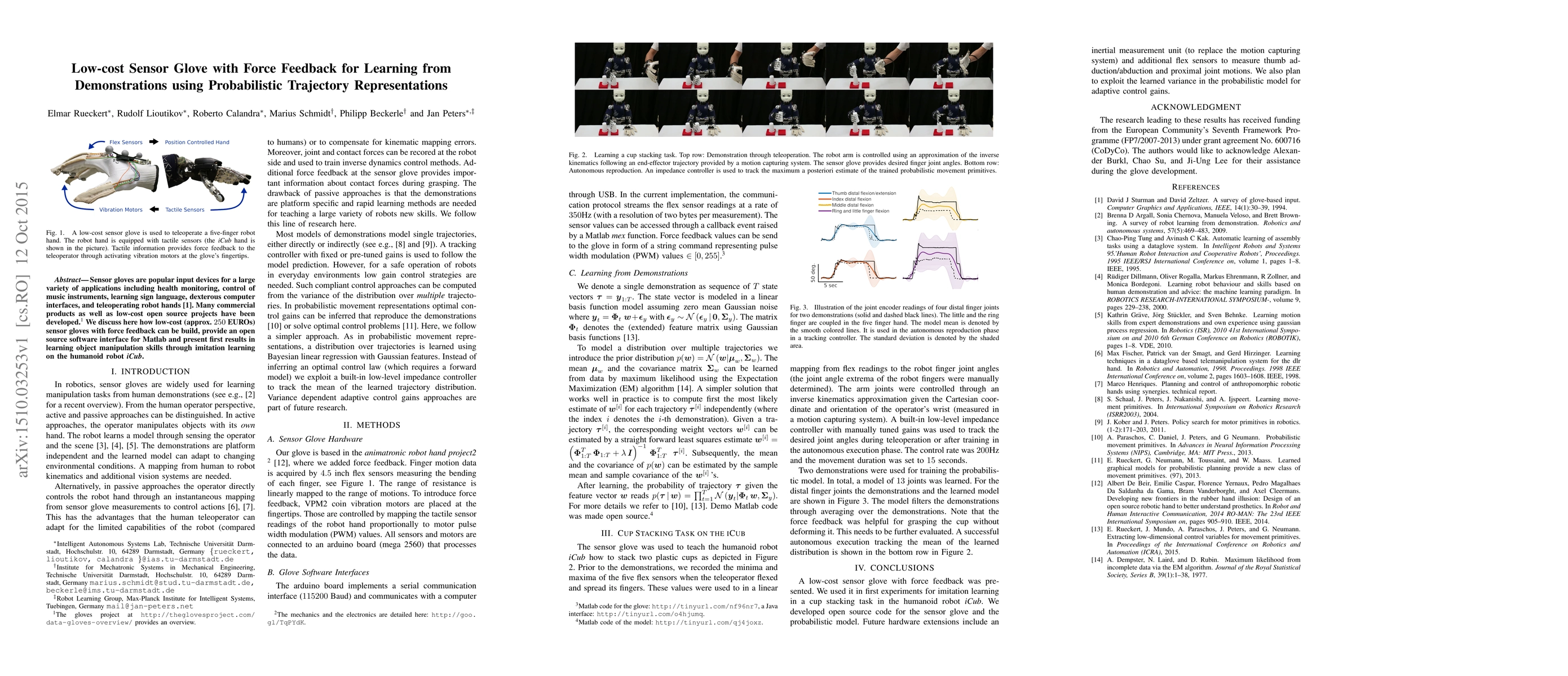 This paper details the construction of a low-cost sensor glove with force feedback, priced at approximately 250 EUROs, and presents an open-source software interface for Matlab. Initial results demonstrate its effectiveness in learning object manipulation skills via imitation learning on the humanoid robot iCub.