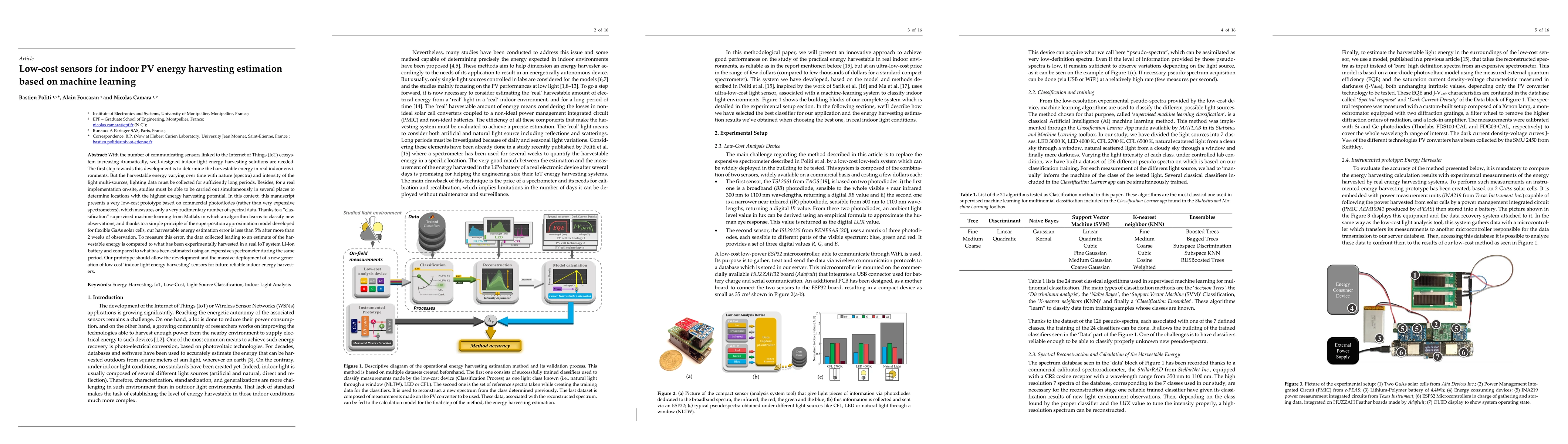 With the number of communicating sensors linked to the Internet of Things (IoT) ecosystem in-creasing dramatically, well-designed indoor light energy harvesting solutions are needed. The first step towards this development is to determine the harvestable energy in real indoor environ-ments. But the harvestable energy varying over time with nature (spectra) and intensity of the light multi-sources, lighting data must be collected for sufficiently long periods. Besides, for a real implementation on-site, studies must be able to be carried out simultaneously in several places to determine locations with the highest energy harvesting potential. In this context, this manuscript presents a very low-cost prototype based on commercial photodiodes (rather than very expensive spectrometers), which measures only a very rudimentary number of spectral data. Thanks to a classification supervised machine learning from Matlab, in which an algorithm learns to classify new observations, and thanks to a simple principle of the superposition approximation model de-veloped for flexible GaAs solar cells, our harvestable energy estimation error is less than 5 percents after more than 2 weeks of observation. To measure this error, the data collected leading to an estimate of the harvestable energy is compared to what has been experimentally harvested in a real IoT system Li-ion battery and compared to what has been estimated using an expensive spectrometer during the same period. Our prototype should allow the development and the massive deploy-ment of a new generation of low cost indoor light energy harvesting sensors for future reliable indoor energy harvesters.