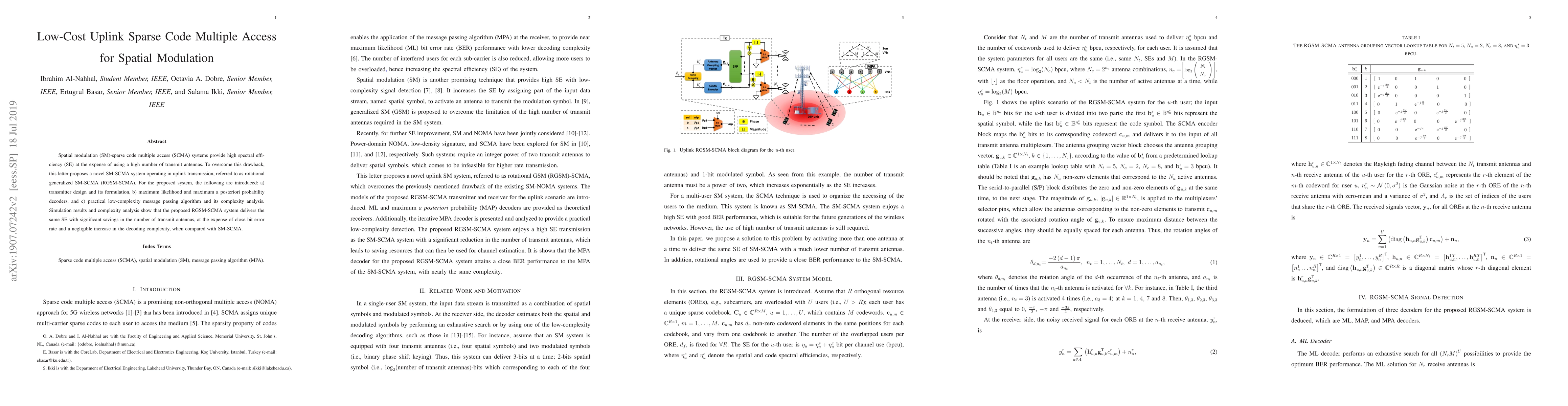 This paper proposes a low-cost uplink sparse code multiple access (SCMA) system called rotational generalized SM-SCMA (RGSM-SCMA) to reduce the number of transmit antennas while maintaining high spectral efficiency. The study introduces a new transmitter design and decoding algorithms, demonstrating comparable performance in terms of spectral efficiency and bit error rate with lower antenna requirements.