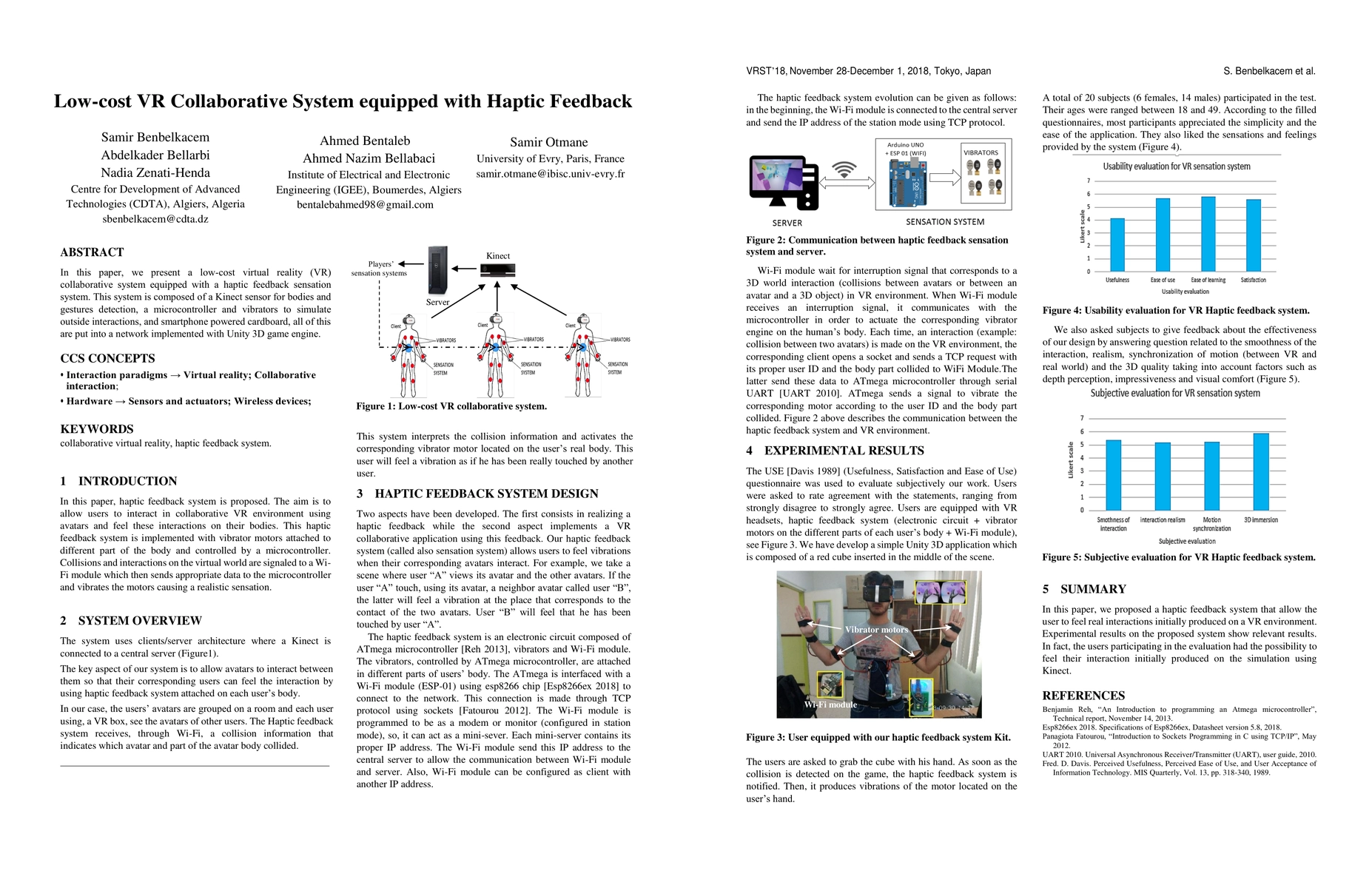 In this paper, we present a low-cost virtual reality (VR) collaborative system equipped with a haptic feedback sensation system. This system is composed of a Kinect sensor for bodies and gestures detection, a microcontroller and vibrators to simulate outside interactions, and smartphone powered cardboard, all of this are put into a network implemented with Unity 3D game engine. CCS CONCEPTS $\bullet$ Interaction paradigms $\rightarrow$ Virtual reality; Collaborative interaction; $\bullet$ Hardware $\rightarrow$ Sensors and actuators; Wireless devices; KEYWORDS collaborative virtual reality, haptic feedback system.