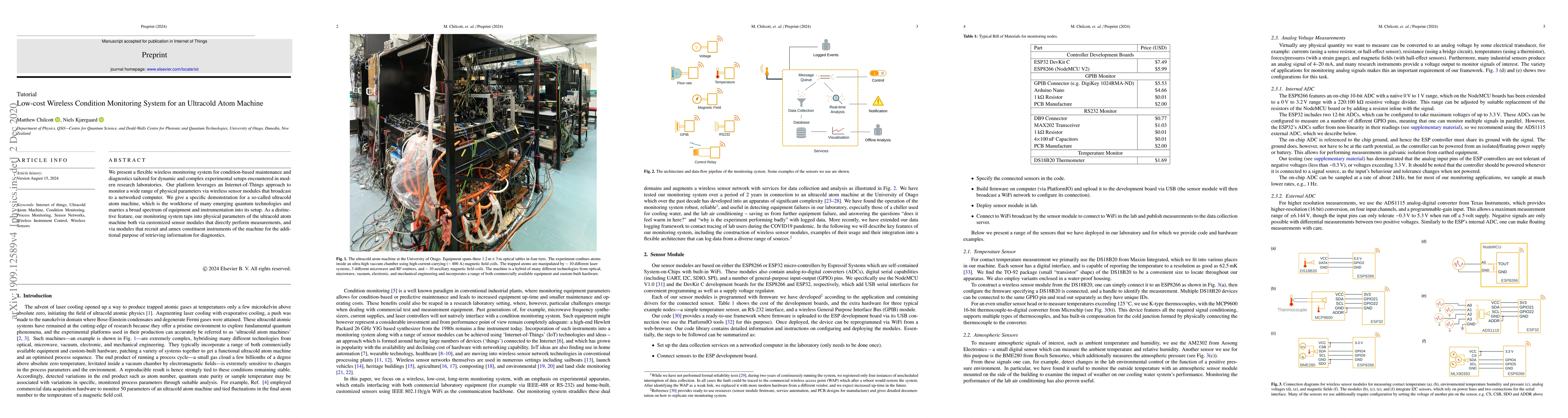 This paper introduces a low-cost wireless monitoring system for condition-based maintenance of an ultracold atom machine, utilizing IoT technology to wirelessly broadcast a variety of physical parameters for diagnostics and maintenance. The system employs both custom sensor modules and integrated instrument modules to gather essential data.