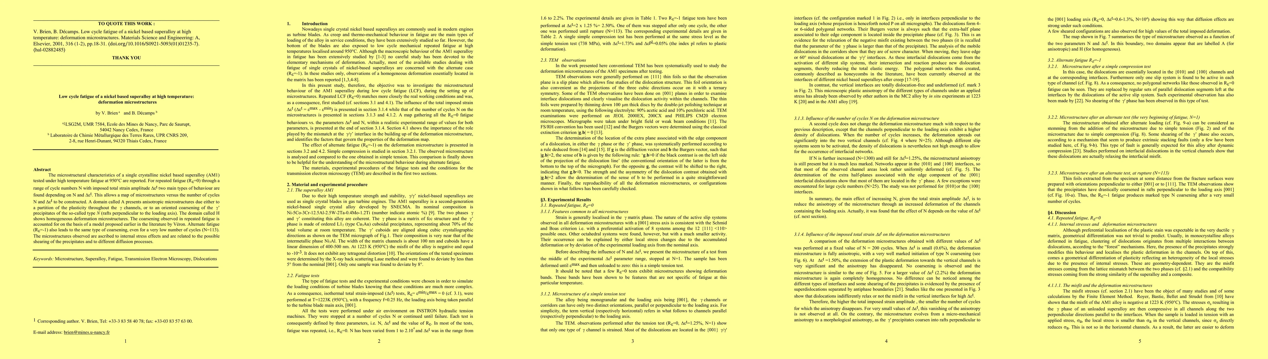 This study investigates the low cycle fatigue behavior of a single crystalline nickel-based superalloy (AM1) at high temperature (950°C), revealing two main deformation microstructures: anisotropic (domain A) and homogeneous (domain H). The microstructures depend on the number of cycles and strain amplitude, with coarsening attributed to internal stress effects and diffusion processes.