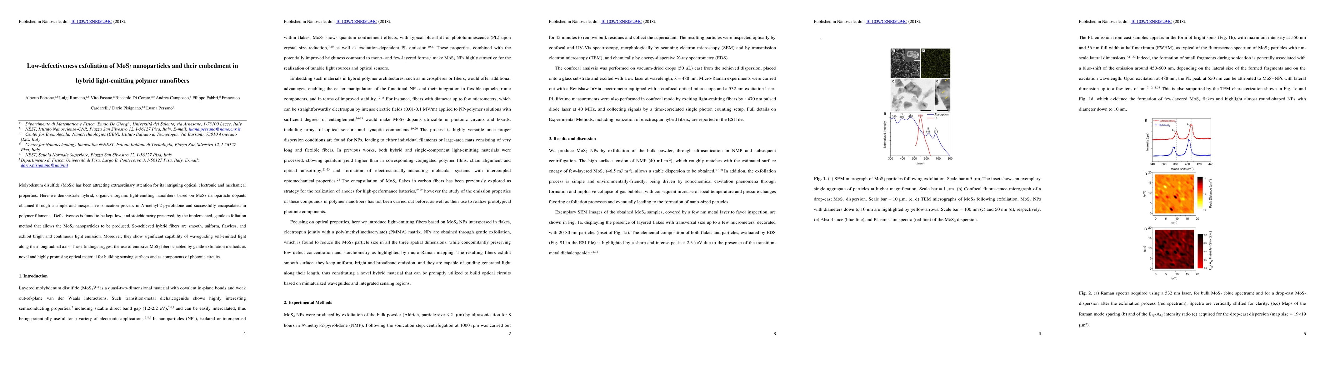 This paper presents a method for low-defectiveness exfoliation of MoS2 nanoparticles using sonication, which are then embedded in hybrid light-emitting polymer nanofibers. The resulting fibers exhibit smooth, uniform, and bright light emission with significant waveguiding capabilities, suggesting potential for optical applications in sensing and photonic circuits.