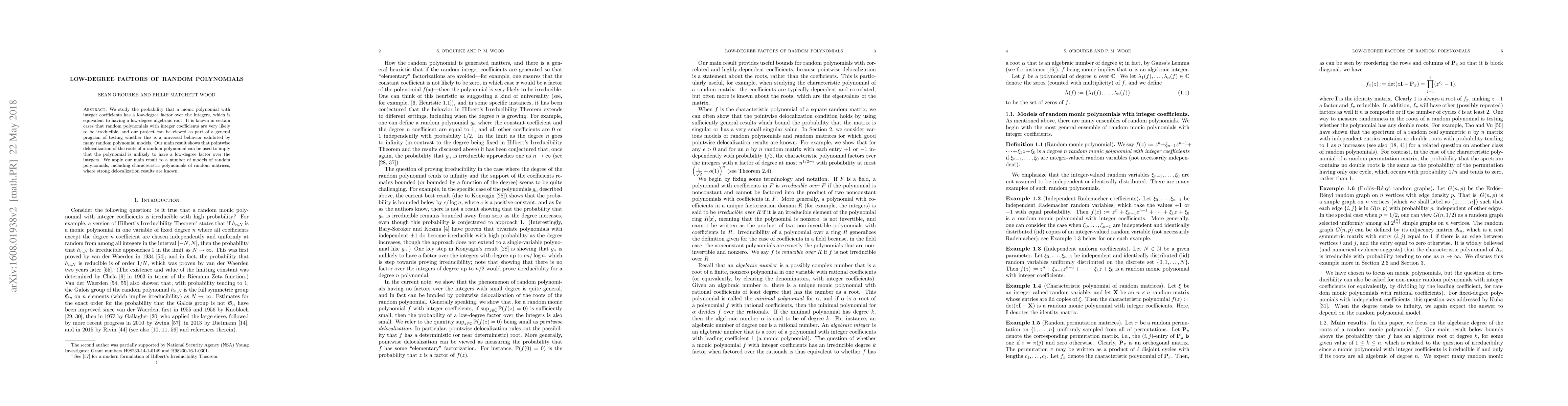 This paper investigates the probability that random polynomials with integer coefficients have low-degree factors, equivalent to having low-degree algebraic roots. The authors demonstrate that strong delocalization of polynomial roots implies the polynomial is unlikely to have such low-degree factors, applying this result to various random matrix models to show that characteristic polynomials of these matrices are also unlikely to have low-degree factors.
