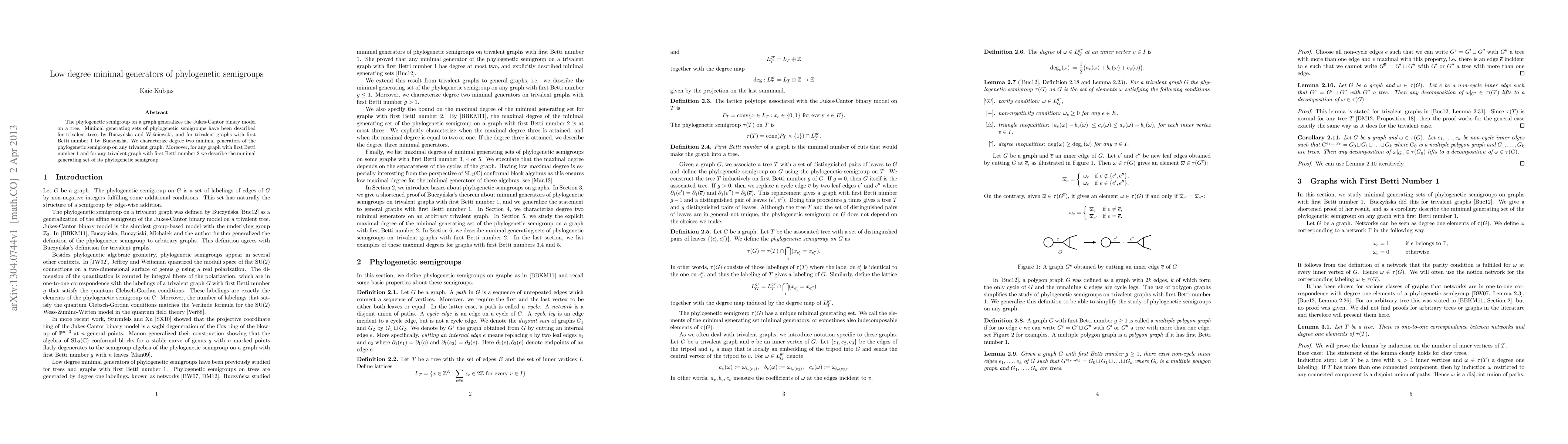 The phylogenetic semigroup on a graph generalizes the Jukes-Cantor binary model on a tree. Minimal generating sets of phylogenetic semigroups have been described for trivalent trees by Buczy\'nska and Wi\'sniewski, and for trivalent graphs with first Betti number 1 by Buczy\'nska. We characterize degree two minimal generators of the phylogenetic semigroup on any trivalent graph. Moreover, for any graph with first Betti number 1 and for any trivalent graph with first Betti number 2 we describe the minimal generating set of its phylogenetic semigroup.