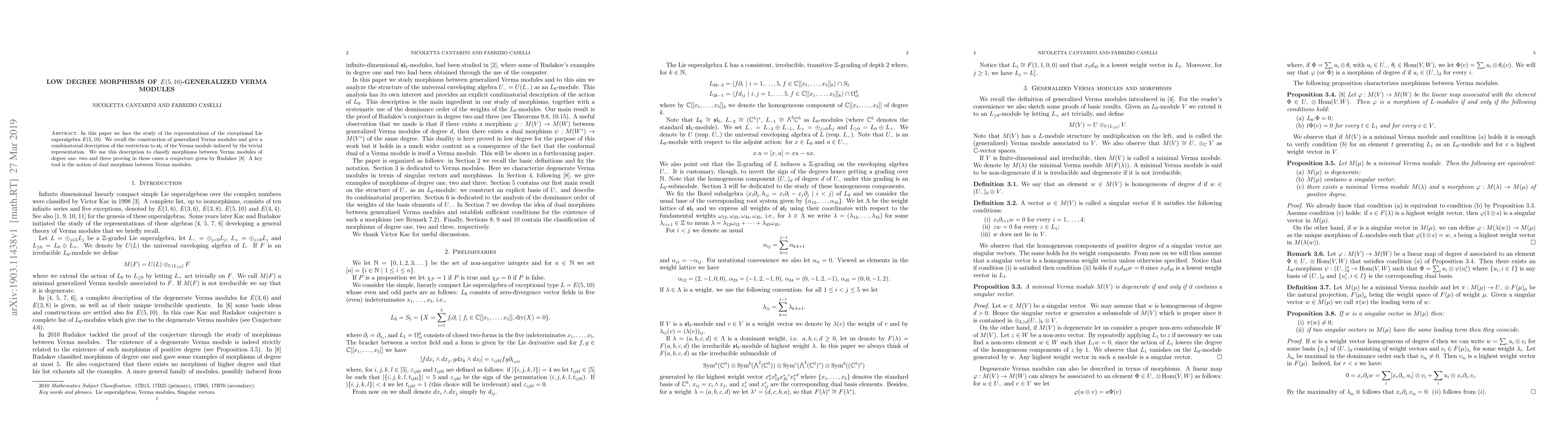This paper studies representations of the exceptional Lie superalgebra E(5,10), focusing on generalized Verma modules and their restrictions to sl_5. It classifies low-degree morphisms between Verma modules, proving a conjecture by Rudakov using dual morphisms and combinatorial techniques.
