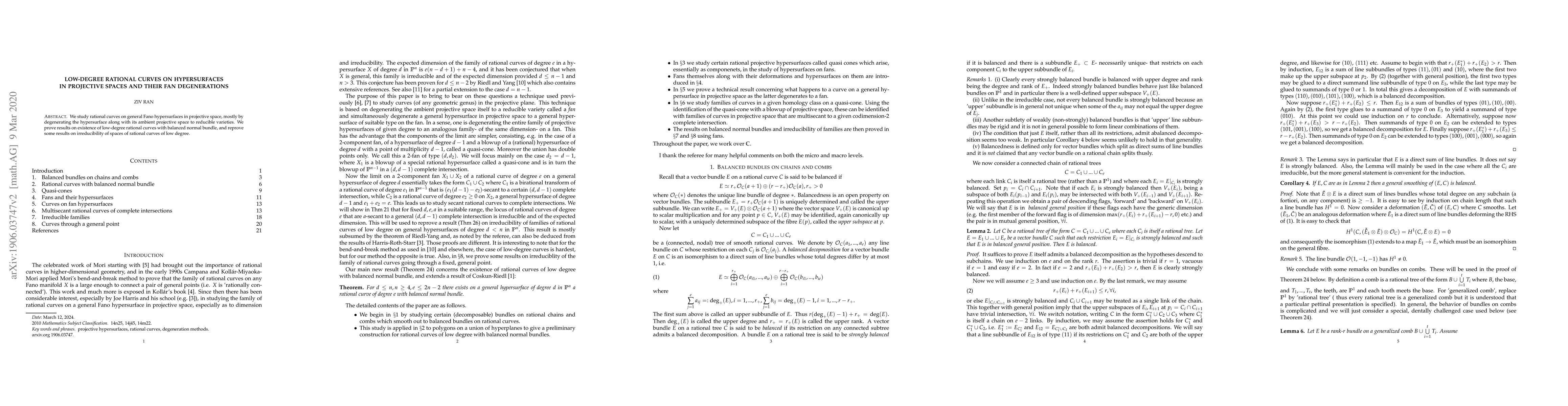 Summary: This paper investigates rational curves on Fano hypersurfaces in projective spaces, primarily through degeneration techniques, and establishes the existence of low-degree rational curves with balanced normal bundles, while also revisiting results on the irreducibility of spaces of such low-degree rational curves.