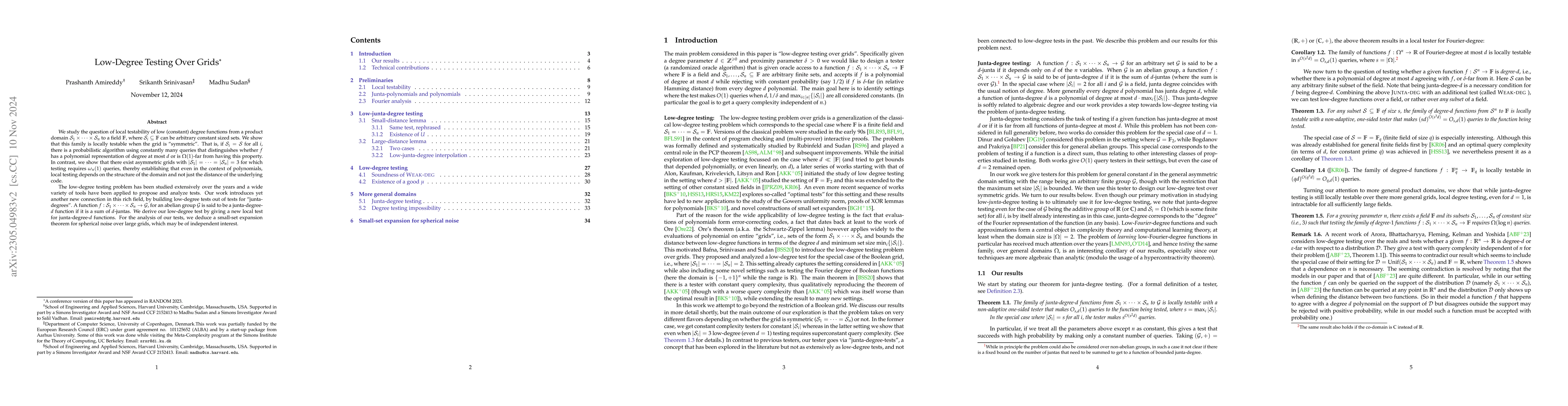 We study the question of local testability of low (constant) degree functions from a product domain $S_1 \times \dots \times {S}_n$ to a field $\mathbb{F}$, where ${S_i} \subseteq \mathbb{F}$ can be arbitrary constant sized sets. We show that this family is locally testable when the grid is "symmetric". That is, if ${S_i} = {S}$ for all i, there is a probabilistic algorithm using constantly many queries that distinguishes whether $f$ has a polynomial representation of degree at most $d$ or is $\Omega(1)$-far from having this property. In contrast, we show that there exist asymmetric grids with $|{S}_1| =\dots= |{S}_n| = 3$ for which testing requires $\omega_n(1)$ queries, thereby establishing that even in the context of polynomials, local testing depends on the structure of the domain and not just the distance of the underlying code. The low-degree testing problem has been studied extensively over the years and a wide variety of tools have been applied to propose and analyze tests. Our work introduces yet another new connection in this rich field, by building low-degree tests out of tests for "junta-degrees". A function $f : {S}_1 \times \dots \times {S}_n \to {G}$, for an abelian group ${G}$ is said to be a junta-degree-$d$ function if it is a sum of $d$-juntas. We derive our low-degree test by giving a new local test for junta-degree-$d$ functions. For the analysis of our tests, we deduce a small-set expansion theorem for spherical noise over large grids, which may be of independent interest.