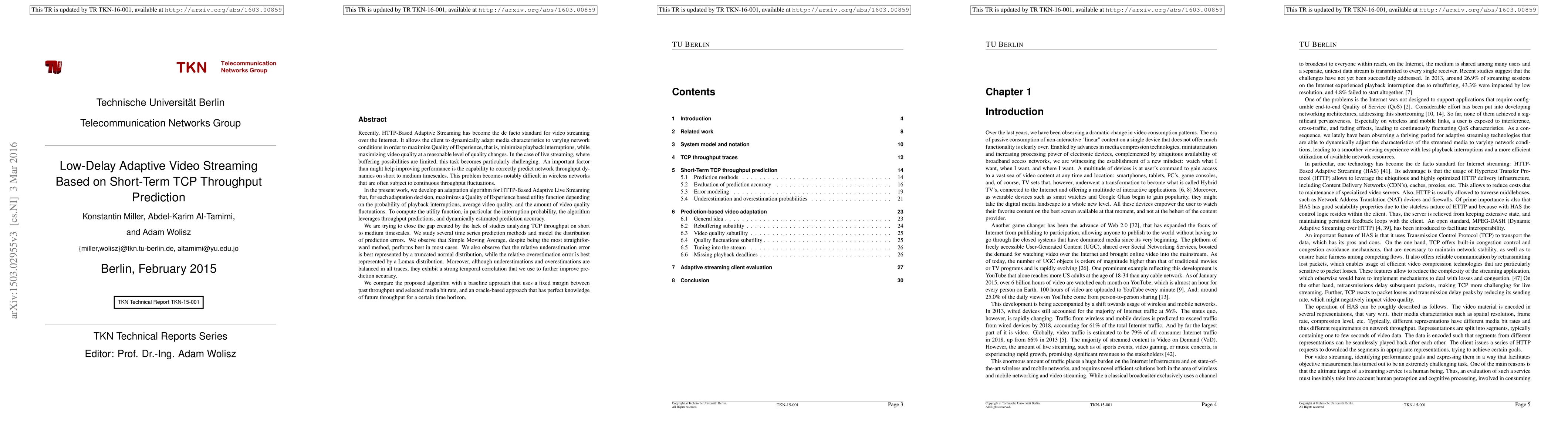 This paper proposes an adaptive video streaming algorithm for live streaming that predicts short-term TCP throughput to optimize Quality of Experience (QoE). The algorithm leverages Simple Moving Average for throughput predictions and dynamically adjusts prediction accuracy, showing improved performance compared to baseline and oracle approaches.